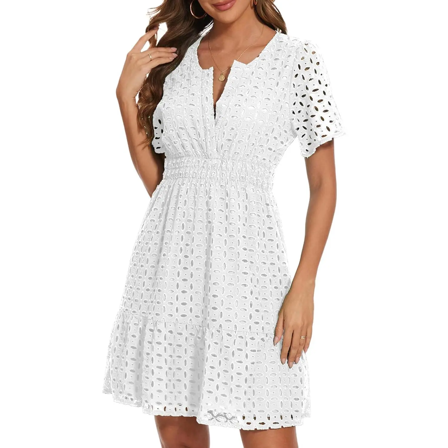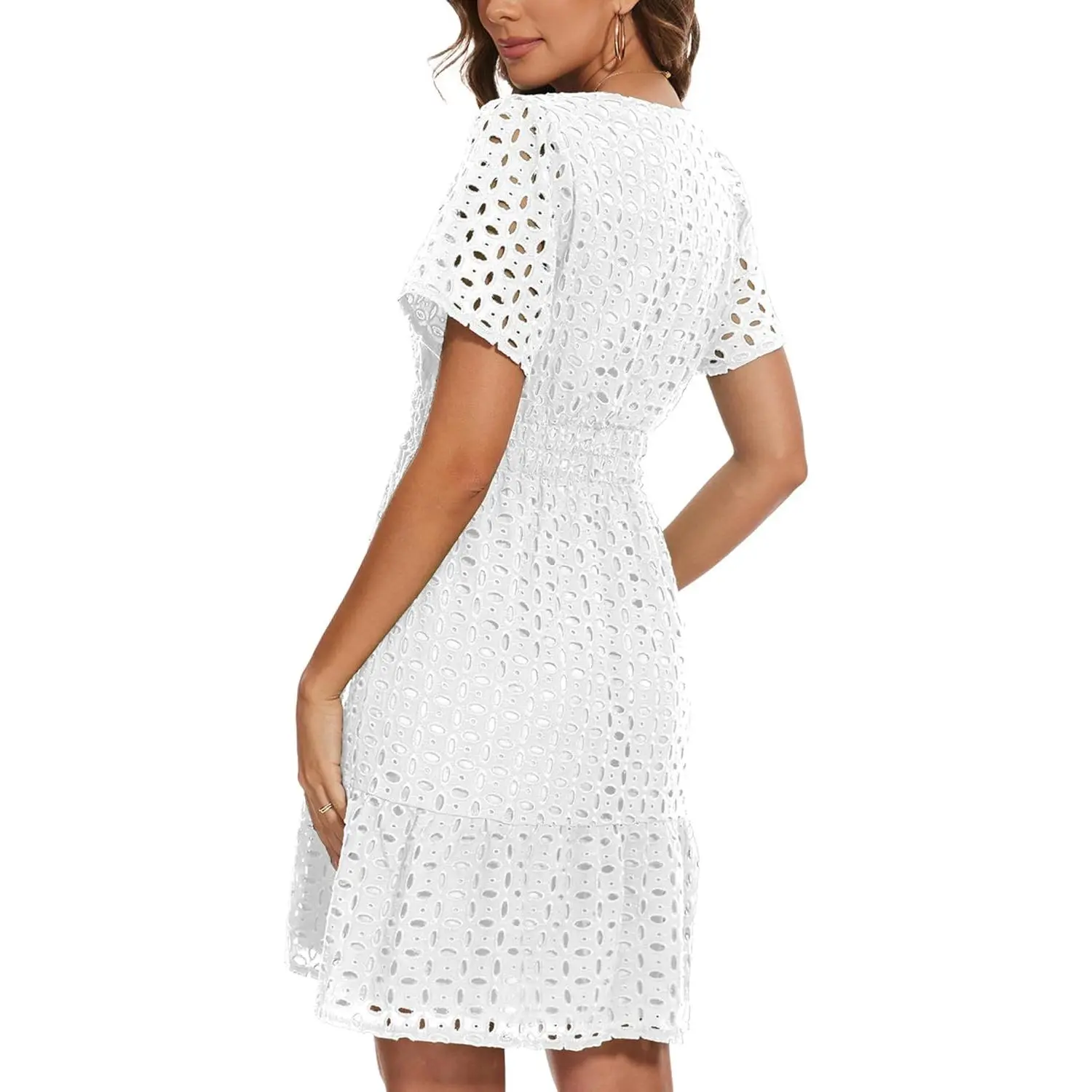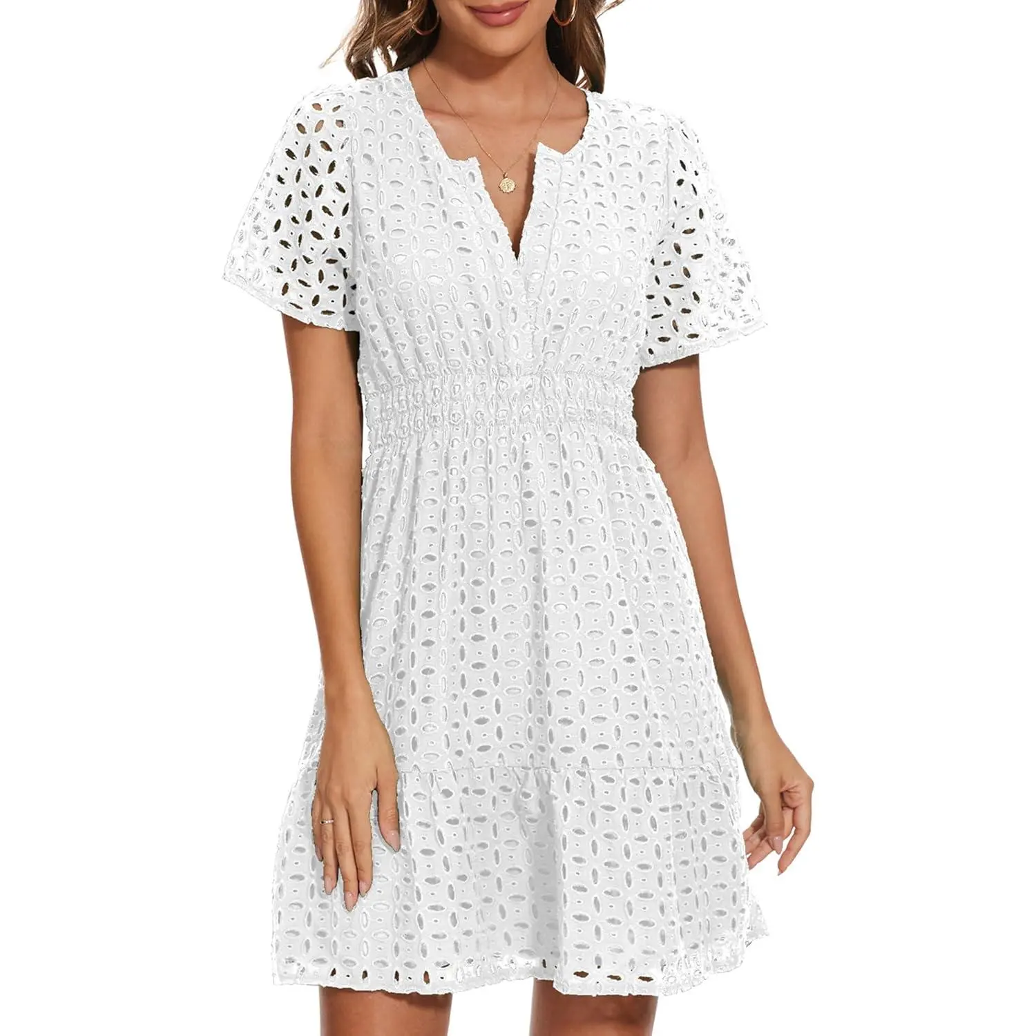 WROLEM Womens Summer Dress Eyelet Short Sleeve V Neck Midi Dress