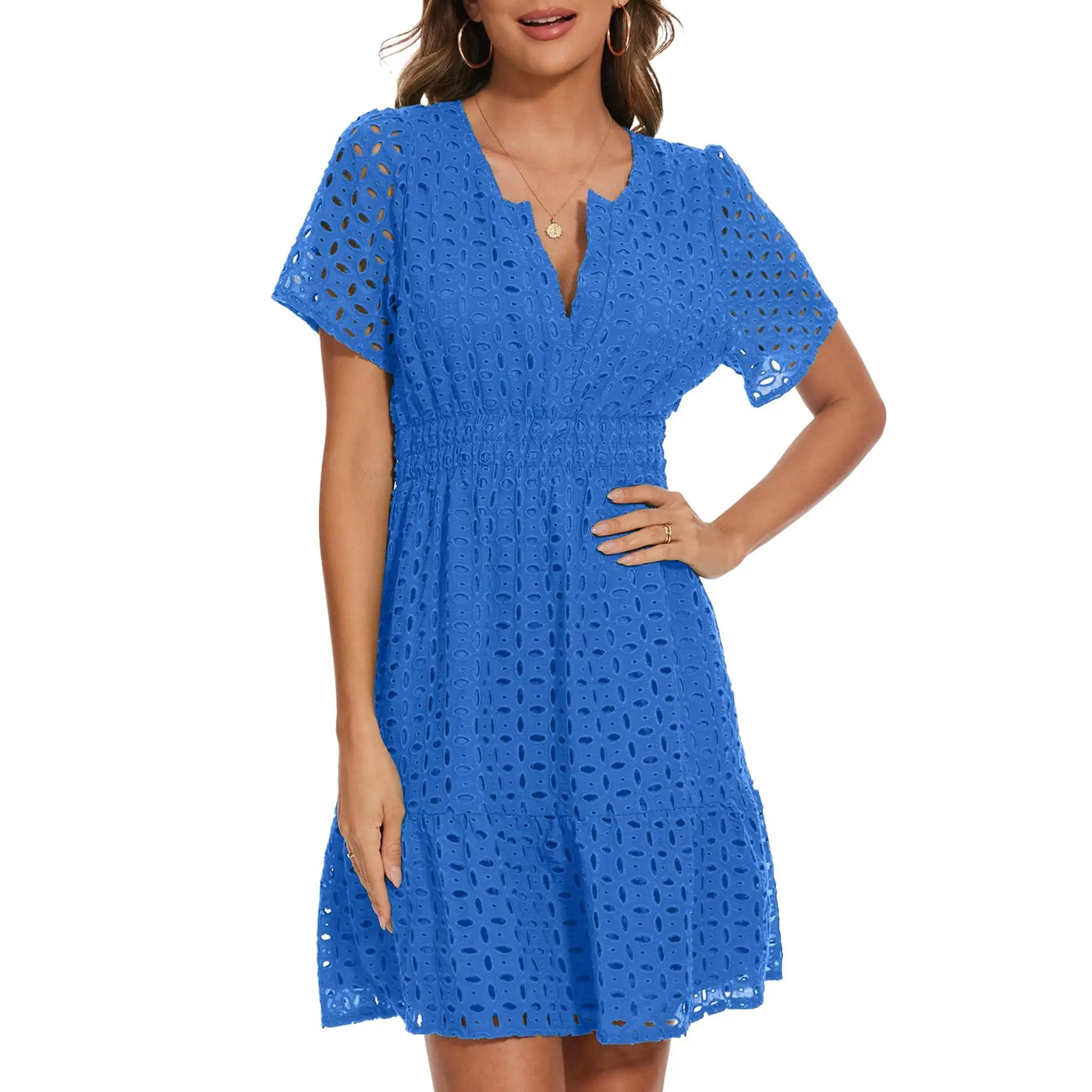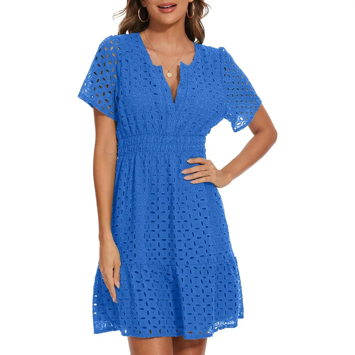 Women's Summer Short Sleeve V Neck Hollow Out Dress Flowy Midi Dress