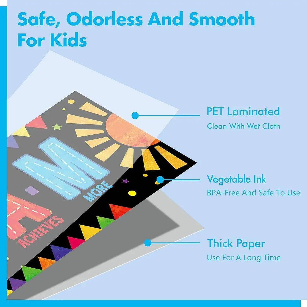 PREMIUM MATERIAL: The decorations are made of thick paper material, durable and handy. Printed with premium plant ink, no odd smell. Coated with PET film, waterproof and easy to clean with damp cloth. All of these ensure the school decorations high durability.