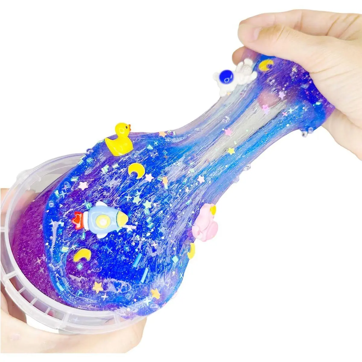 Super Good Texture Clear Slime Barrel with 6 add-ins for kids to DIY to make Jelly Cube Slime,Glimmer Crunchy Slime,Candy Confetti Slime,Ice Cube Slime. This Clear Glue Slime Is Super Stretchy,Soft, Non-Sticky, Will Not Tear When You Stretch It.