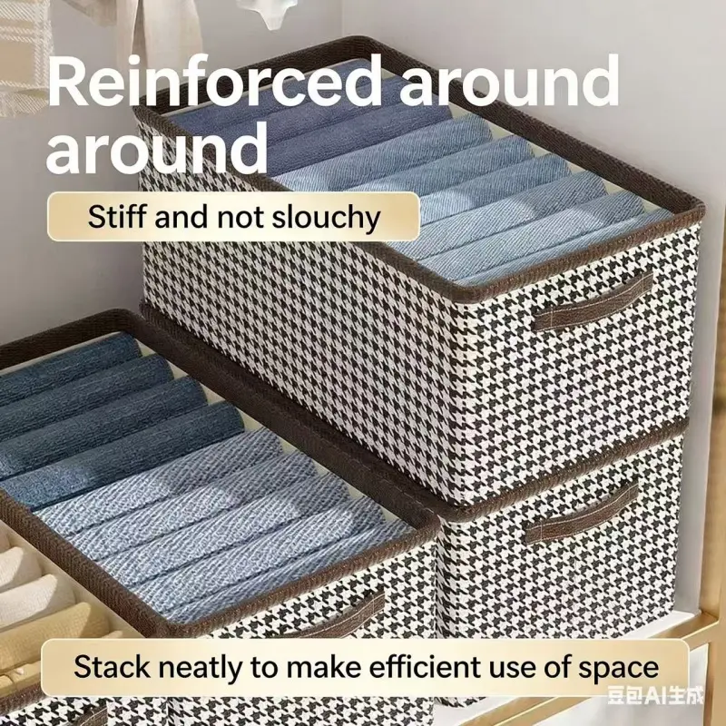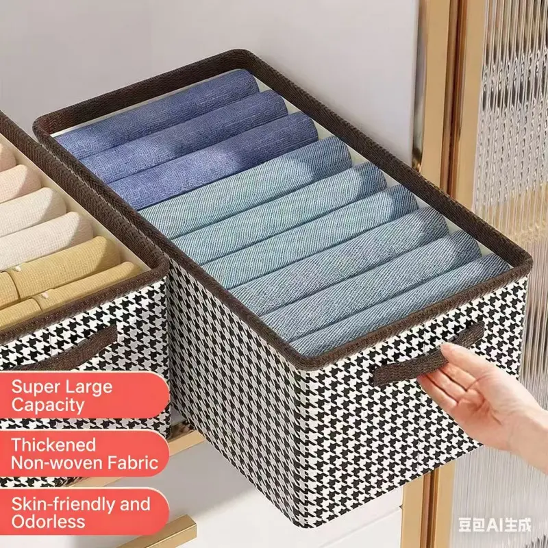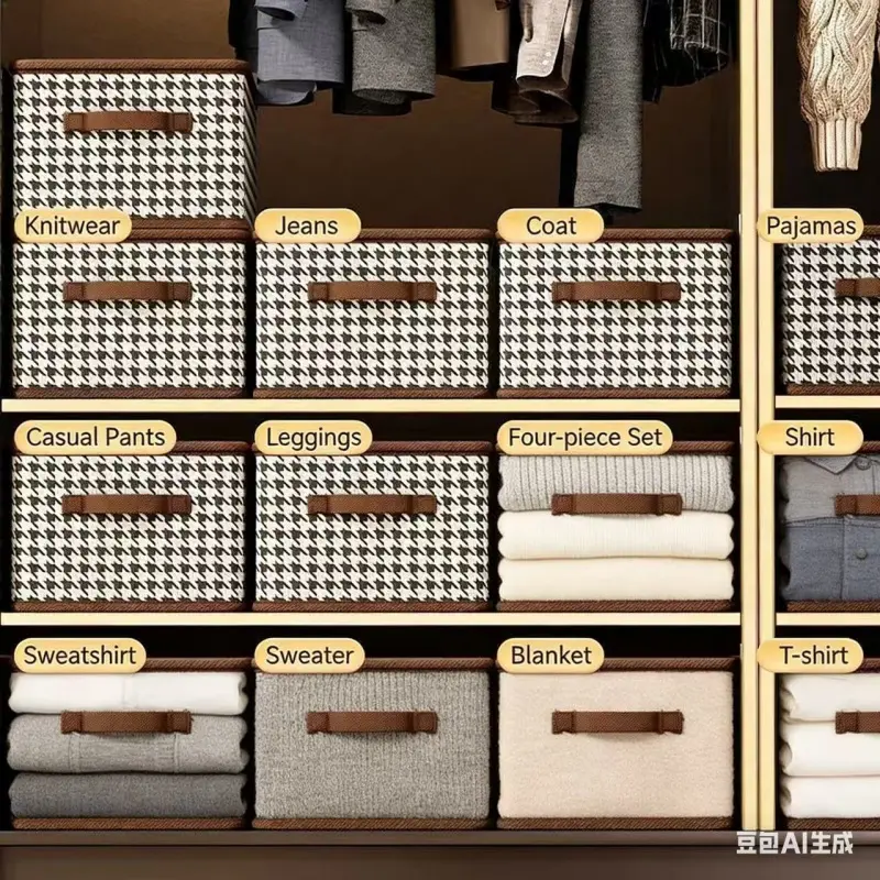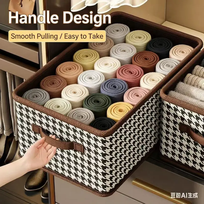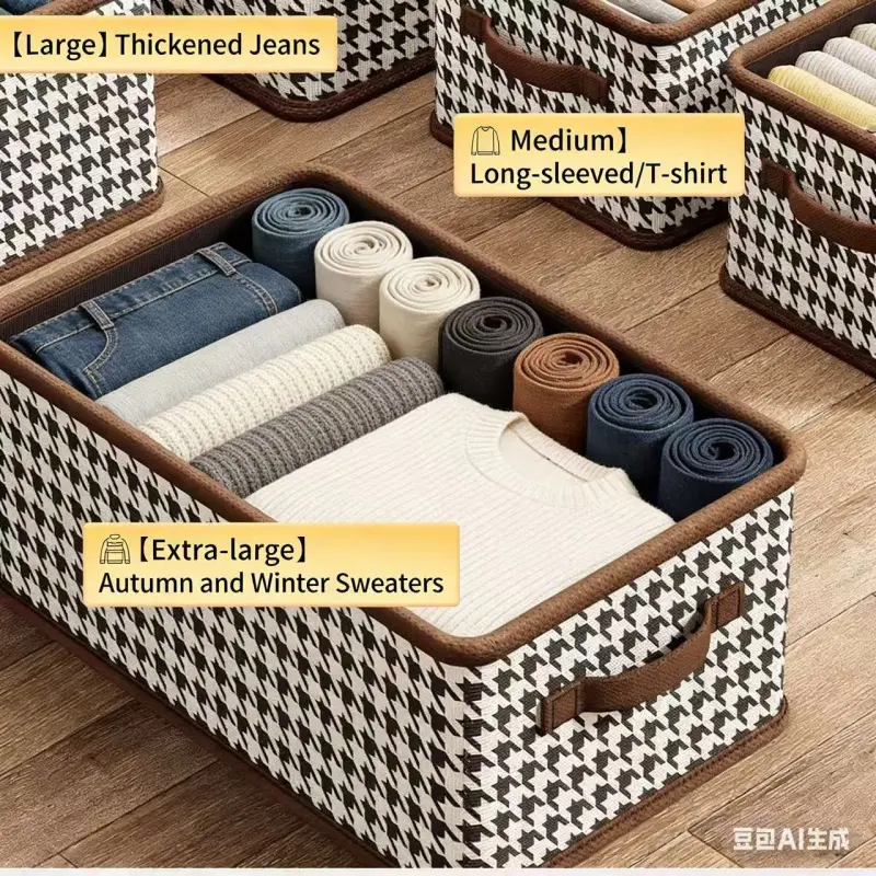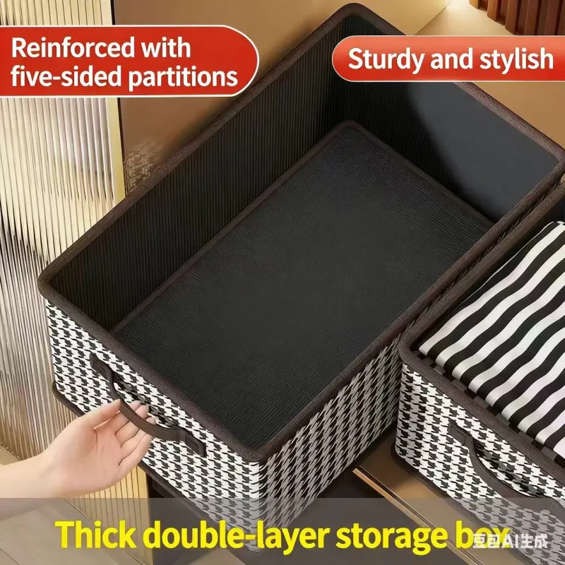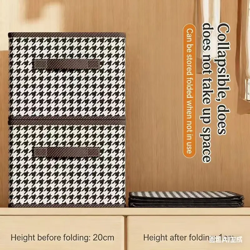 This large-capacity household storage box features a classic houndstooth pattern and is made of thickened double-layer fabric, offering an outstanding texture and durability. The box dimensions are 40*28*20 cm, providing ample space and perfectly fitting into wardrobes, shoe racks, and box shelves for various storage scenarios. It easily organizes clothing, shoes, socks, bathroom items, and other household objects. The product is reinforced with a five-sided PP partition construction, making the box sturdy and resistant to collapse or deformation, with stronger load-bearing capacity. It is equipped with convenient side handles for easier lifting and retrieval. It supports a foldable design, allowing for quick folding and storage when not in use, without taking up extra space. It is highly adaptable and can be used in various home settings, including bedrooms, bathrooms, and throughout the house. It is a practical and useful item for home organization and storage