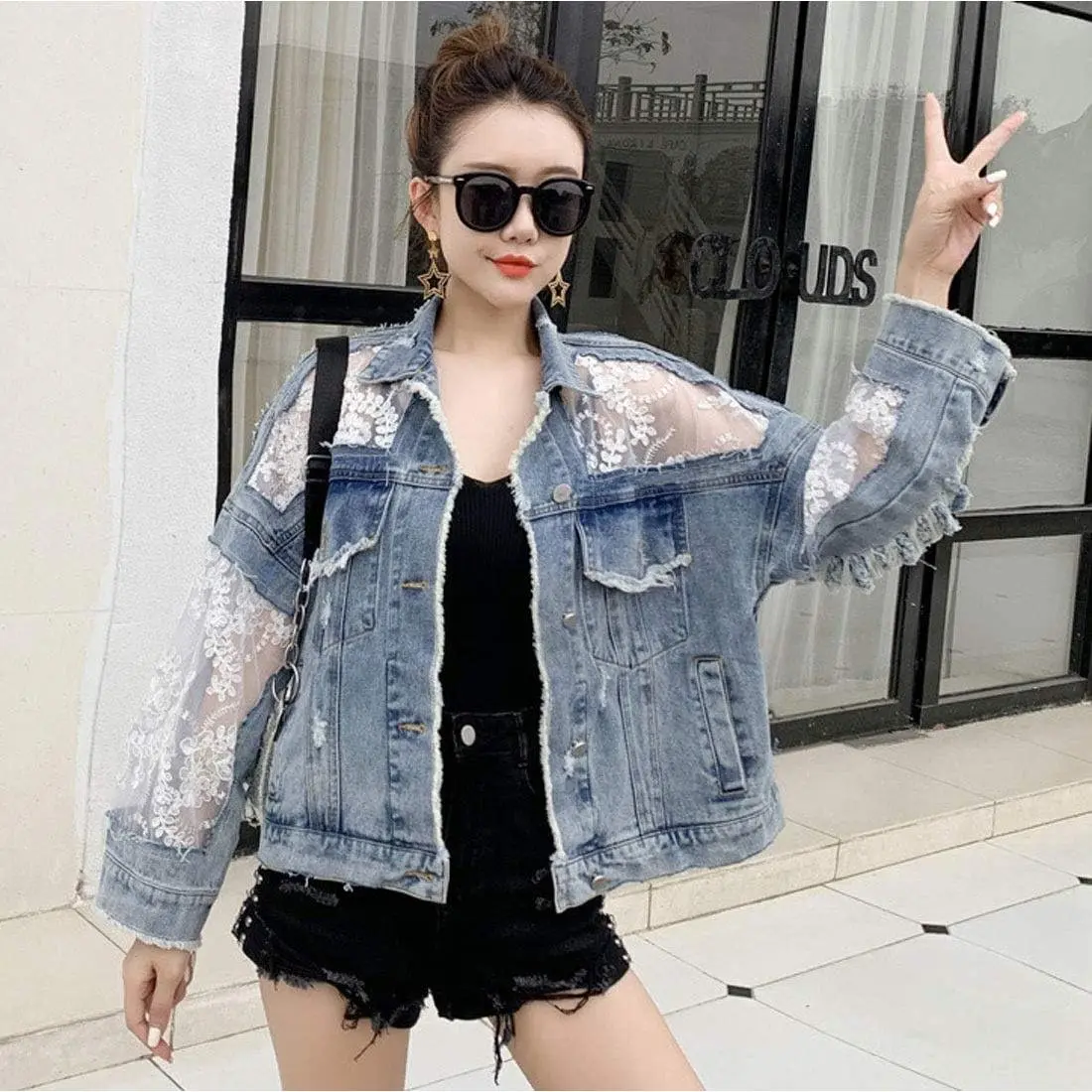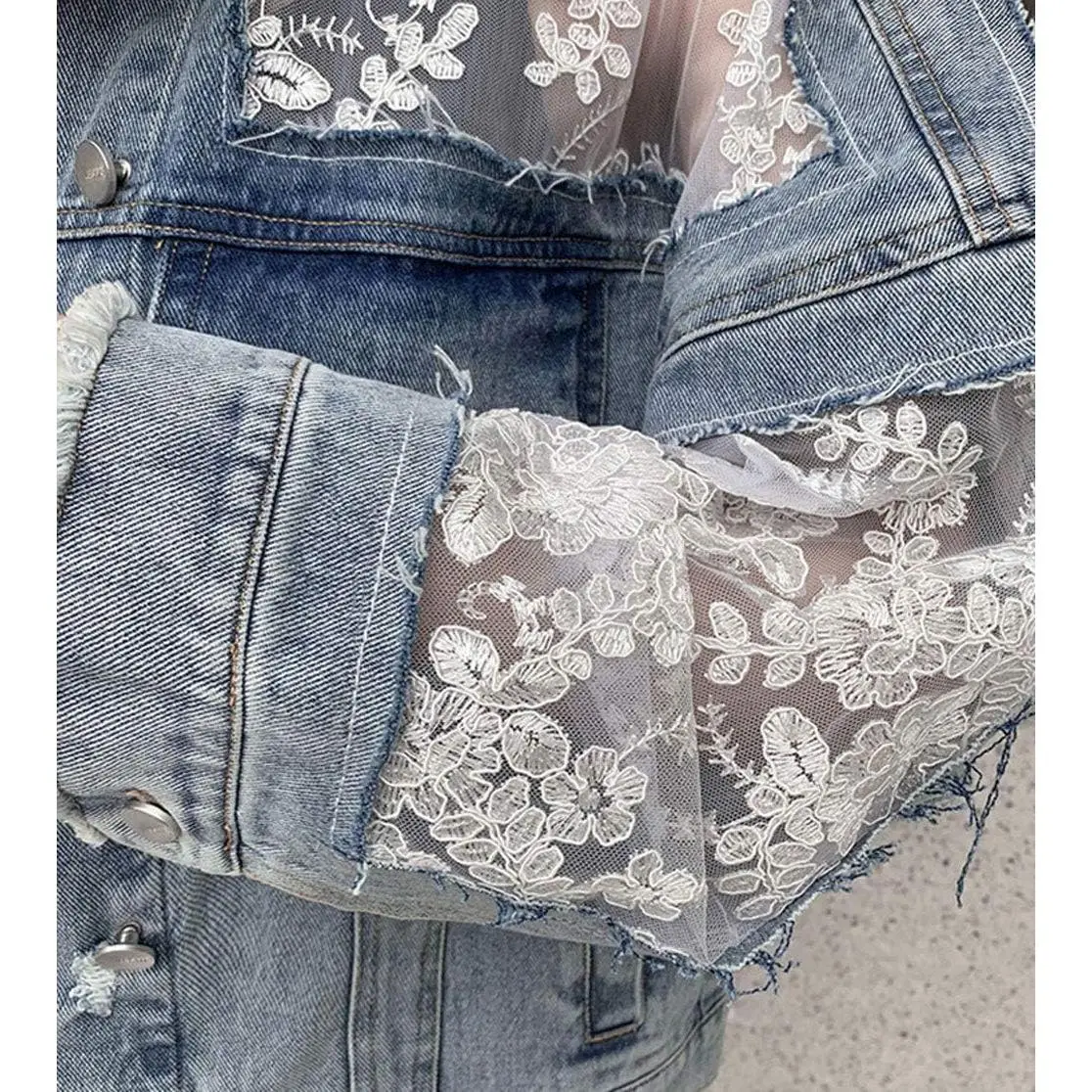 Women's See Through Floral Embroidery Lace Crop Denim Jacket Ripped Distressed Jean Jacket
