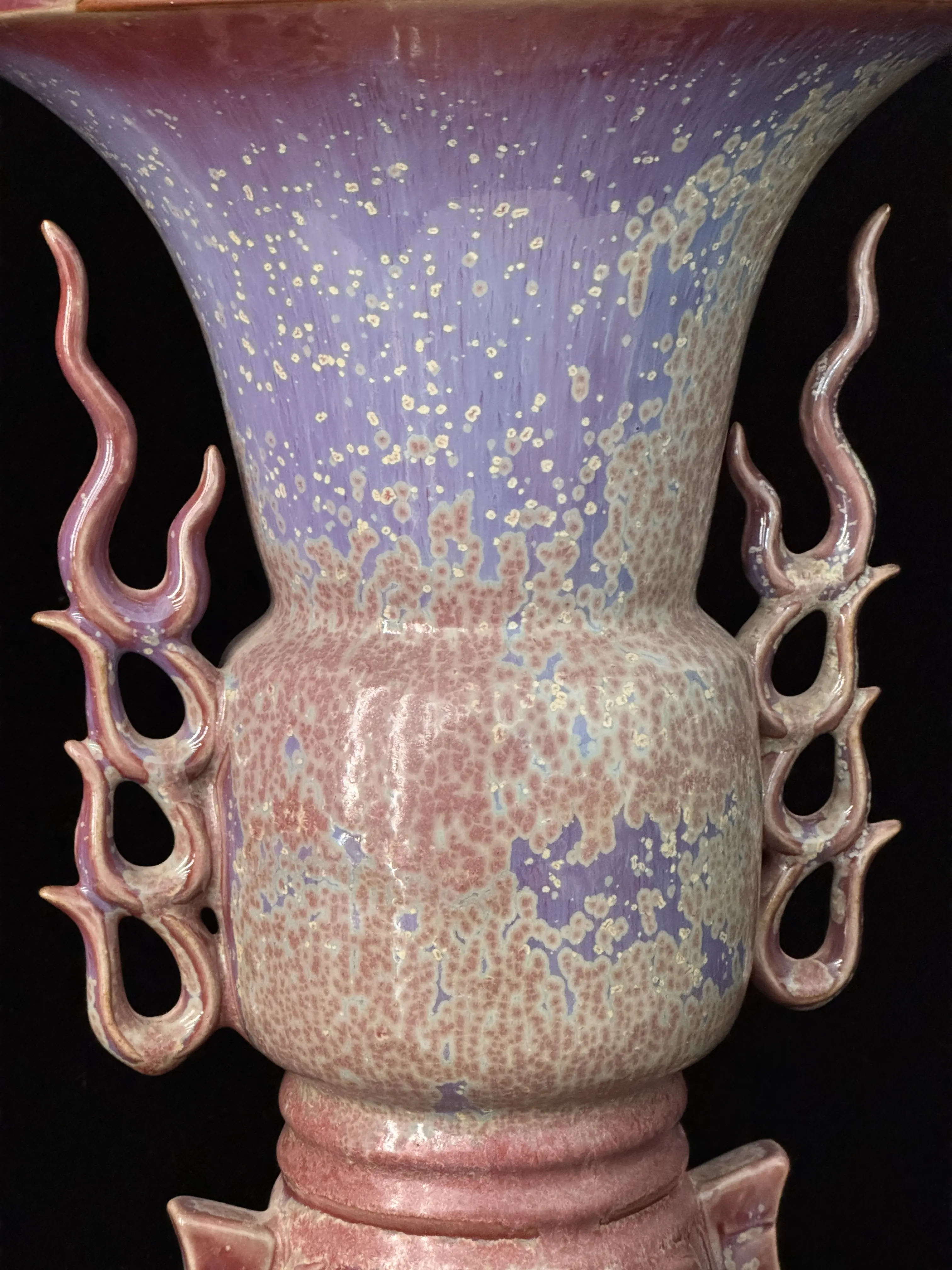 ✨ Discover the Handmade Chinese Jun Porcelain Gu Vase, a sacred ritual vessel. It features flame handles and a purple-pink kiln-fired glaze. This unique piece is a masterpiece of Asian art decor. Perfect for collectors and enthusiasts of traditional craftsmanship.