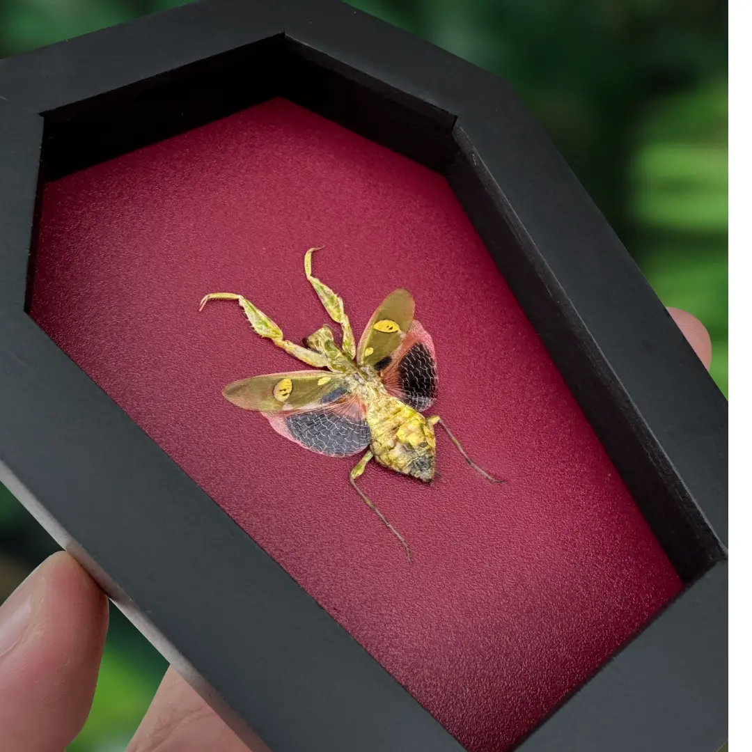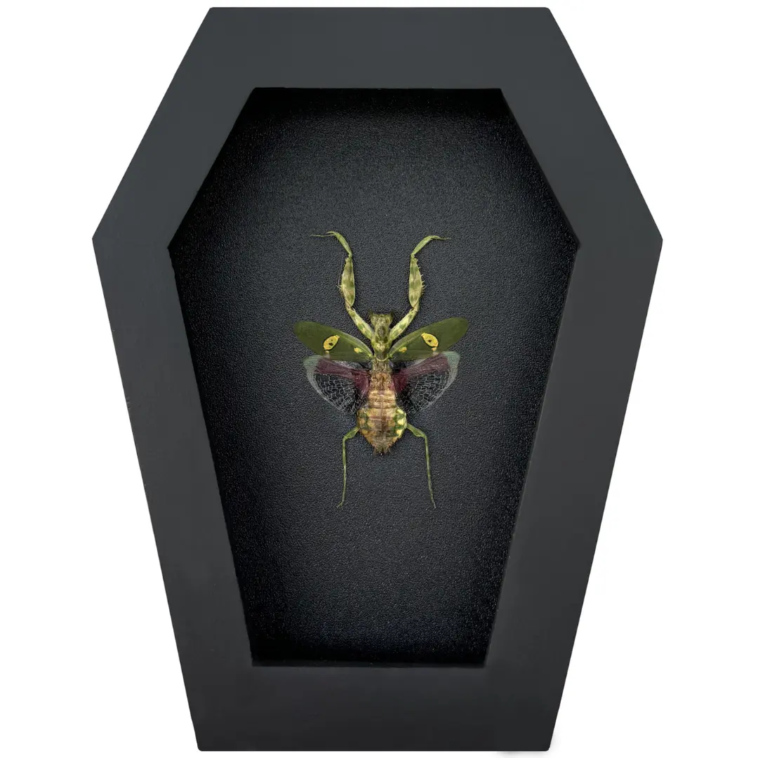 Gothic Green Flower Mantis in Coffin Frame, Spooky Halloween Insect, Preserved Specimen Display, Entomology Curiosity Decor, Scientific Oddity, Home Accent
