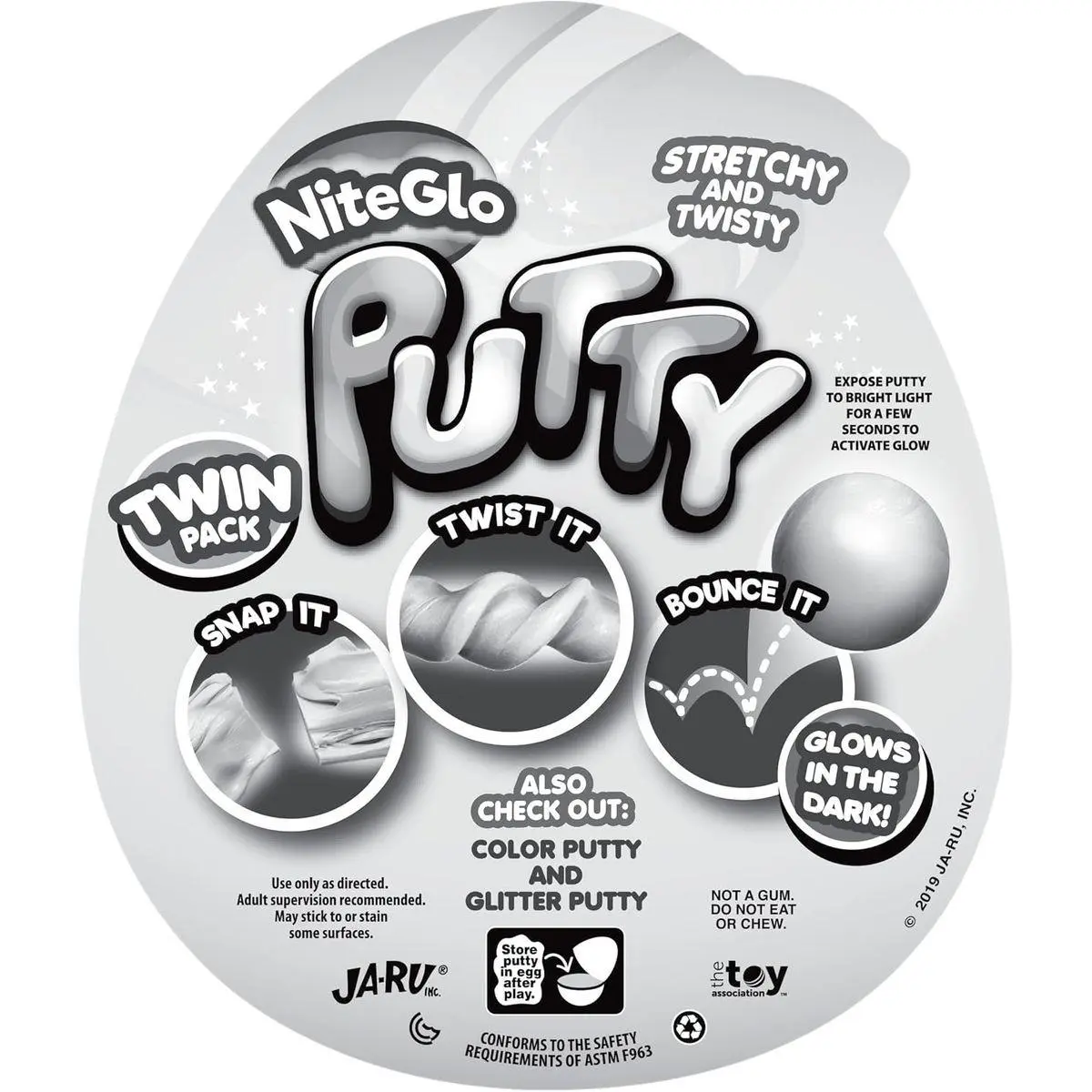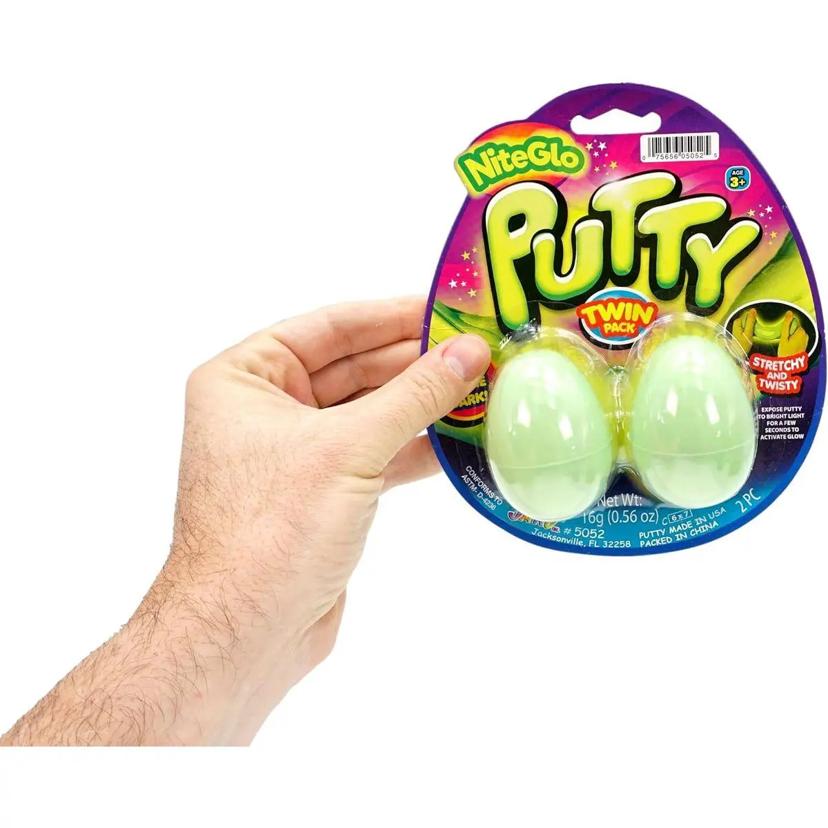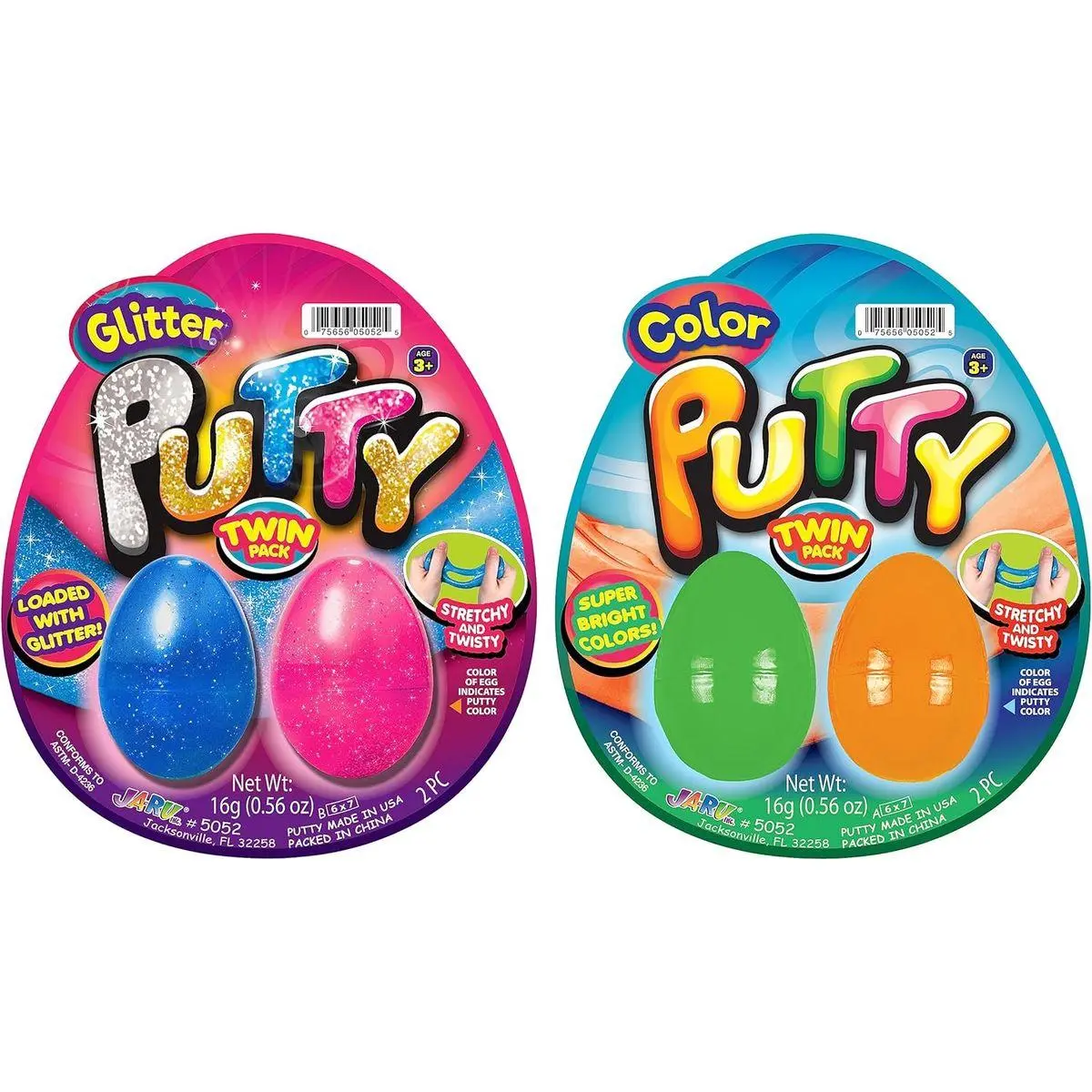 2 Pack of Egg Putty - Each twin pack includes 2 putty, each in its own plastic egg-shaped container. Comes in fun, randomly assorted styles - Neon colored bouncing putty, Glitter Putty or Glow in the Dark putty. Includes 1 FunaTon Sticker.