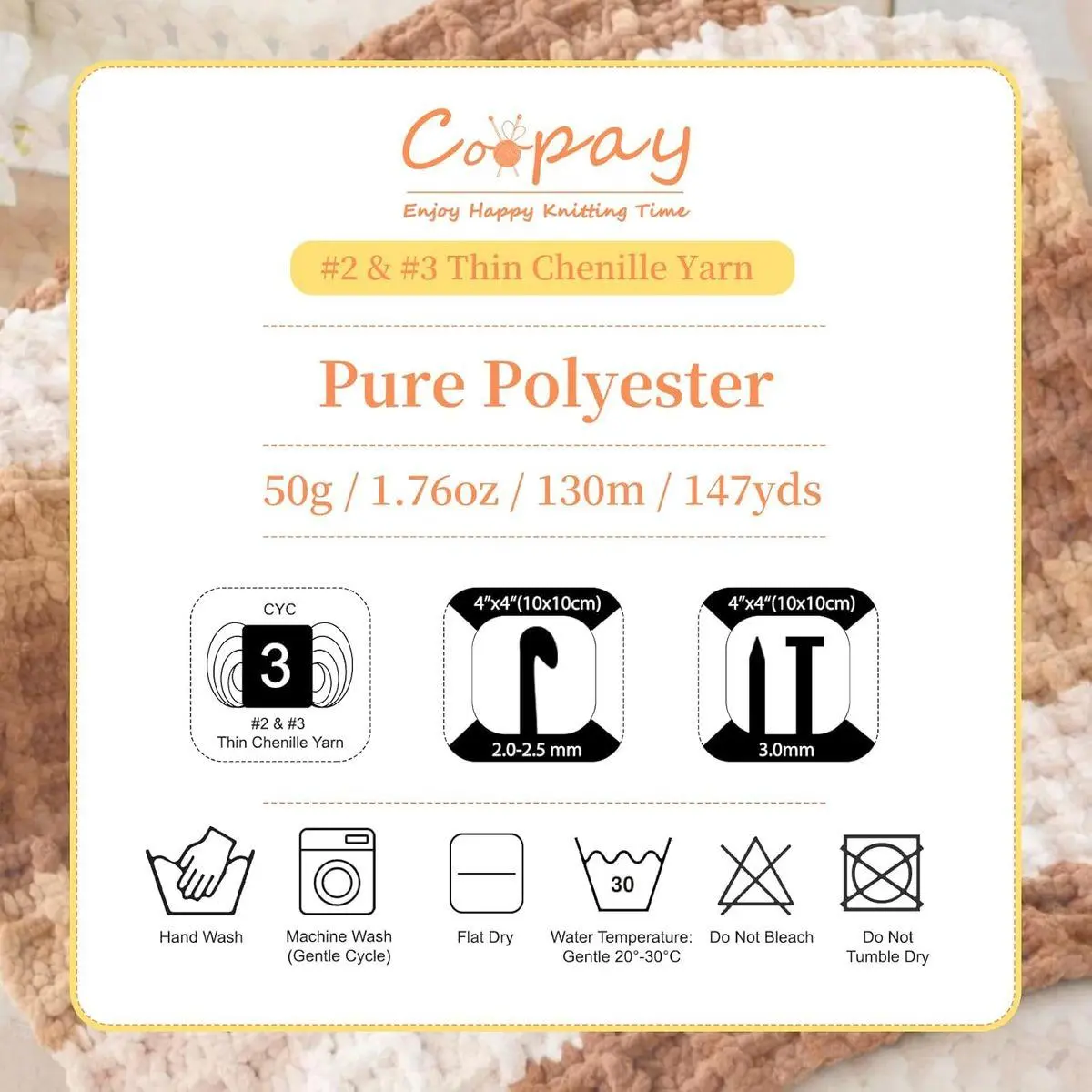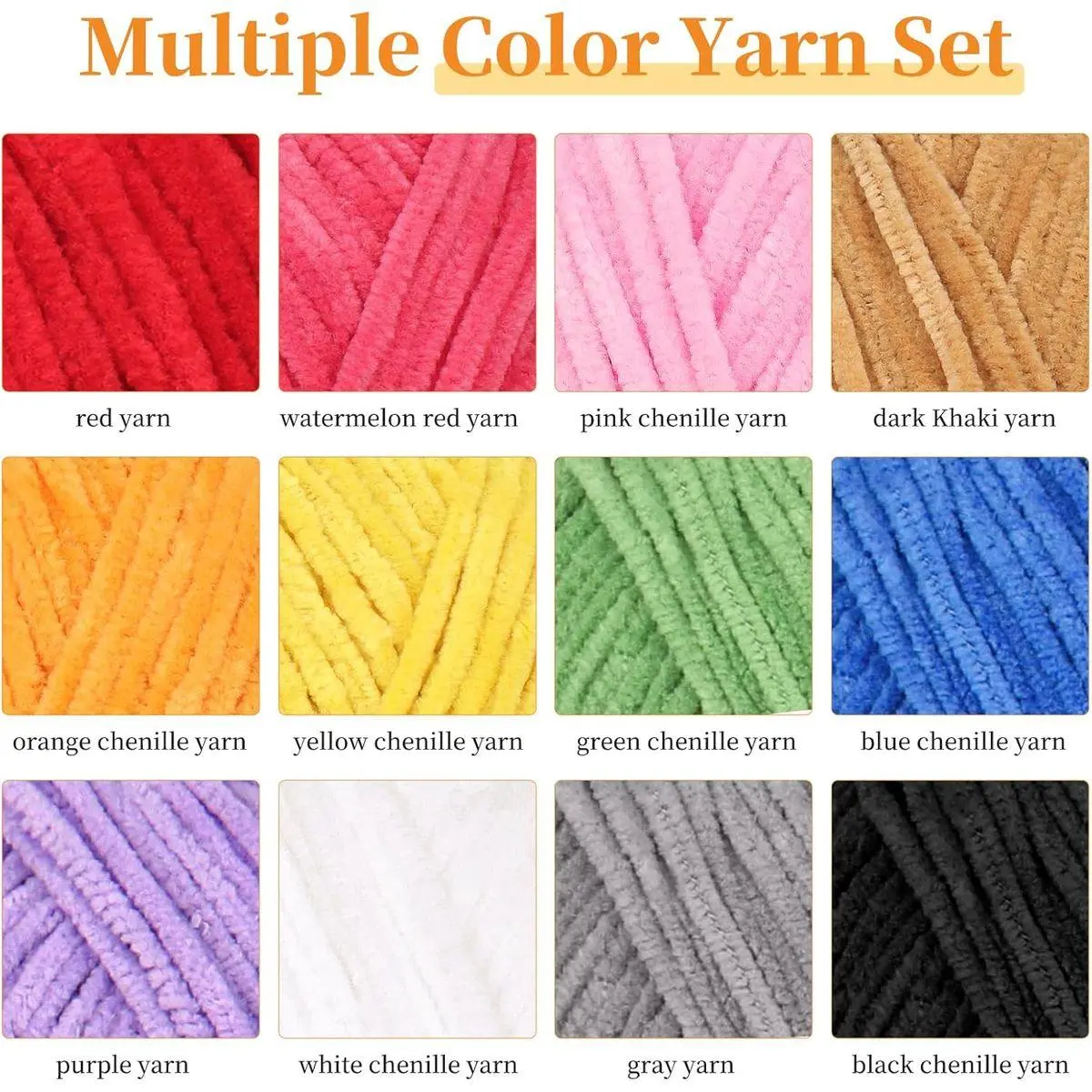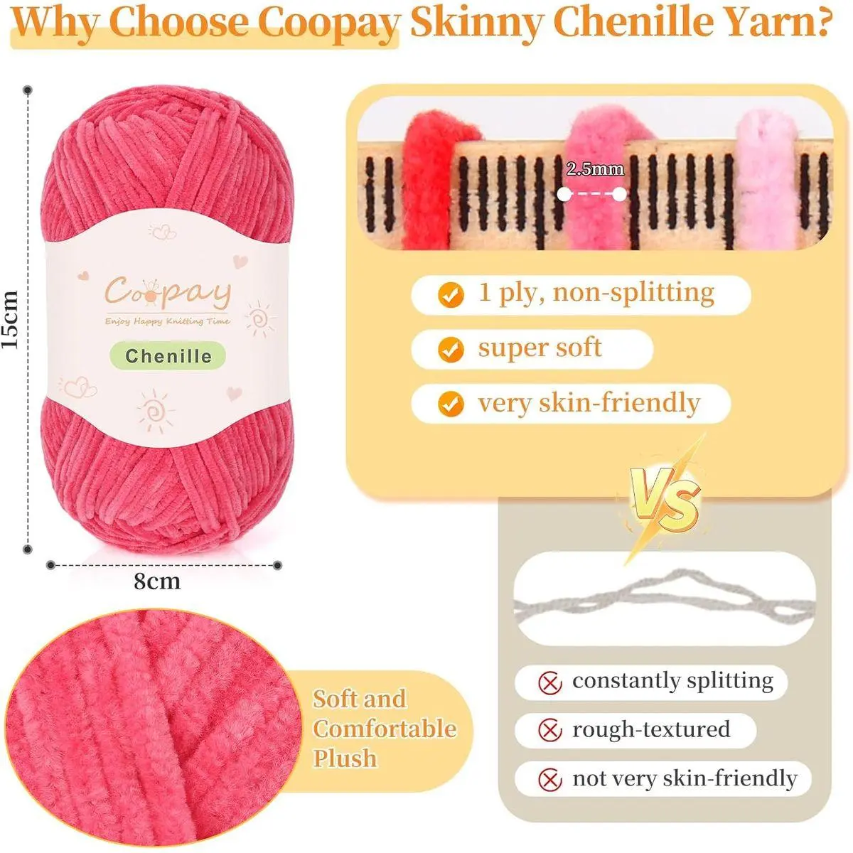1. 12 Vibrant & Beautiful Colors: This chenille yarn pack comes with 12 carefully selected matte colors that are bright and vivid, meeting diverse needs for different handmade projects. 50g/1.76oz, 135m/147yd per skein - light weight DK yarn - skinny chenille yarn. We highly recommend matching with 2-2.5mm crochet hooks or 3mm knitting needles for smooth crafting experience