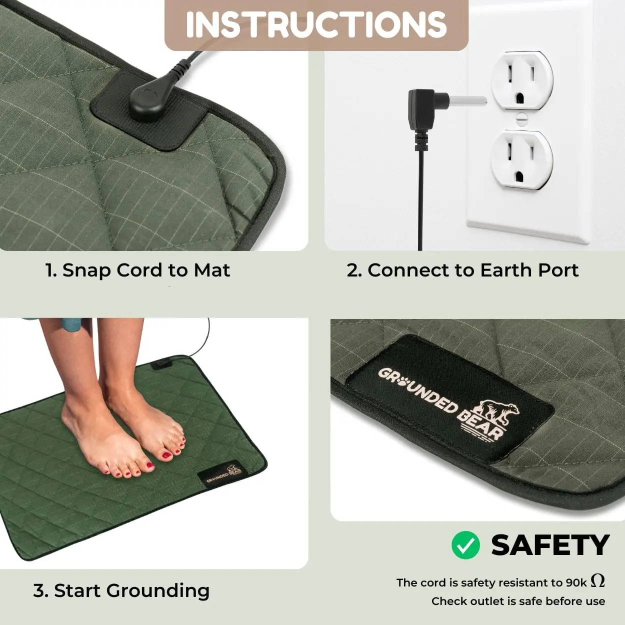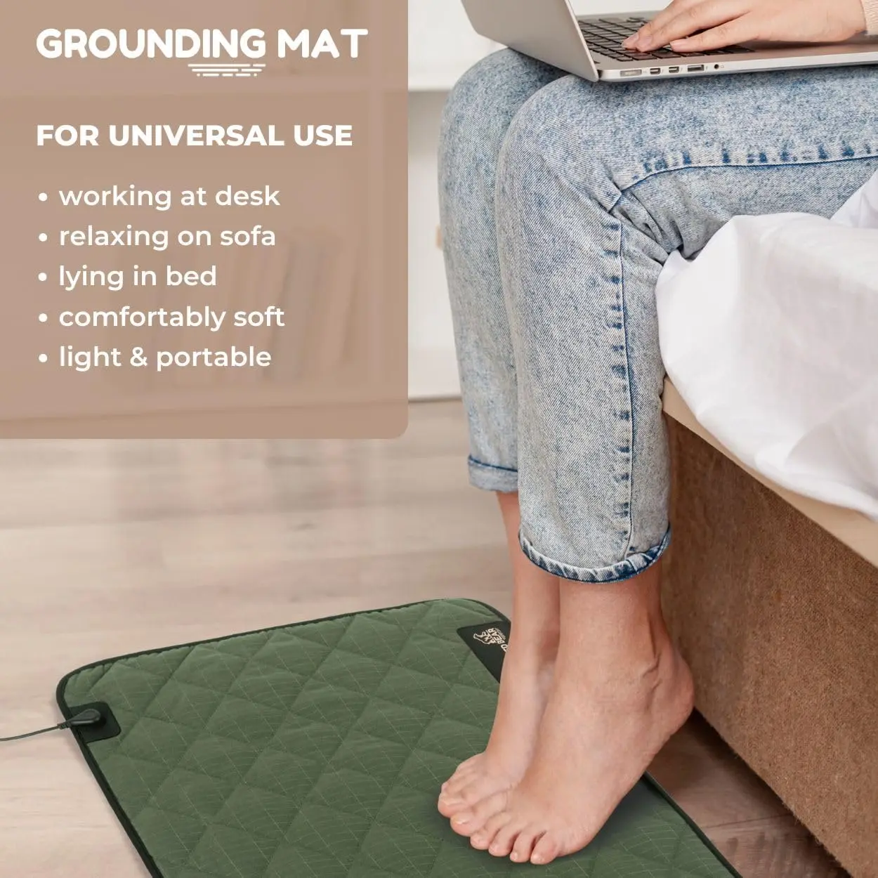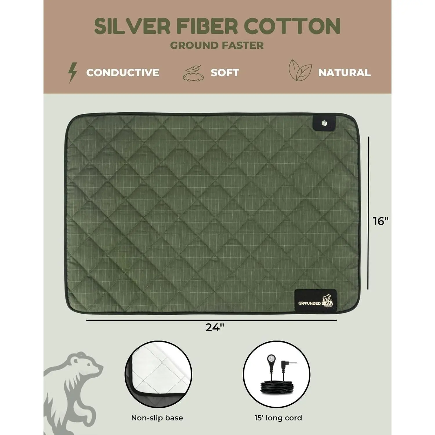 VERSATILE USE FOR EVERYDAY WELNESS: Crafted from soft cotton, it's a grounding mat for feet, at your desk, bed and more.Experience the softness of cotton to simulate the sensation of moss under your feet.SILVER FIBER COTTON: High-conductivity silver for efficient grounding.Our grounding mattress pad, maximizes grounding benefits by improved conductivity.SUPERIOR COMFORT FOR RESTFUL SLEEP: Sized at 24x16", our grounding bed mat is an easy, portable size.The grounding pad for bed can be used when relaxing, working or sleeping.LIGHTWEIGHT NON-SLIP DESIGN: For a stable grounding experience, this ground pad is highly portable, and can be rolled or folded easily into your bag and be your grounding matt for bed or work, and when you're on the move.CONNECT NATURALLY, LIVE FREE: Grounded Bear ground mat combines premium materials and advanced grounding technology, offering a holistic approach to wellness that fits seamlessly into your routine.