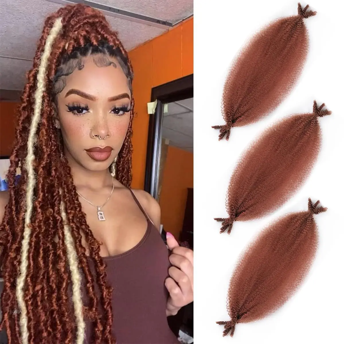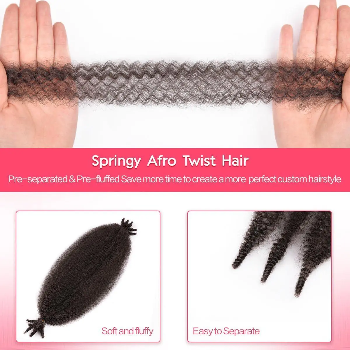 3.Advantages: Spring twist hair is Soft lightweight,Stretchy,Pre seperated and Pre-fluffed,easy for installation and will hold long-lasting time,Perfect for customizing hairstyles you will adore.