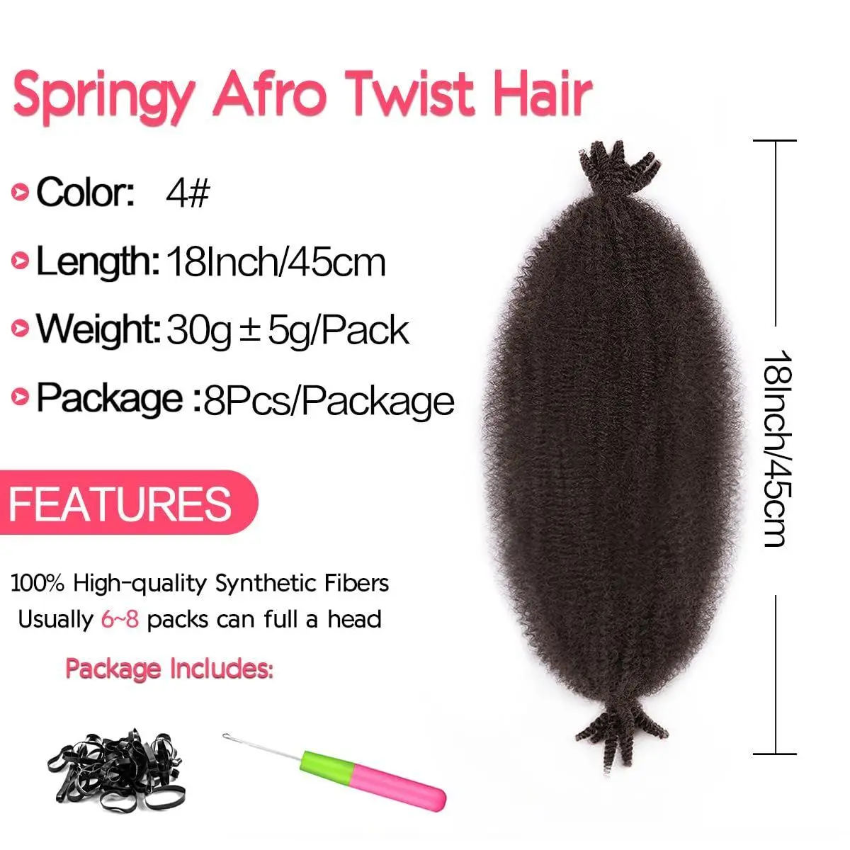 2.Product Specifications: Length 16 inch 30g/Pack(8 Packs/Lot,3 Packs/Lot), available color: 1B#, 30#, 4#, 27#, 350#, 1B/30/27#. Marley twist braiding hair is usually 6-8 packs are needed for a full head.