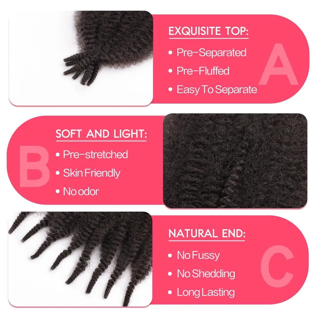 1.Hair Material: Afro twist hair extensions made of premium quality synthetic fiber. Natural looking and soft touch as Human Hair,Suitable For Spring & Bomb Twist Styles, Jumbo box braids or other soft hairstyles.