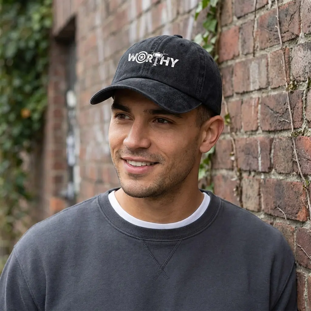 5. Vintage WORTHY From The Strongest Avenger Printed Wash Hat, Washed Baseball Cap streetwear , Gift For Him Her, Funny Movie Hat