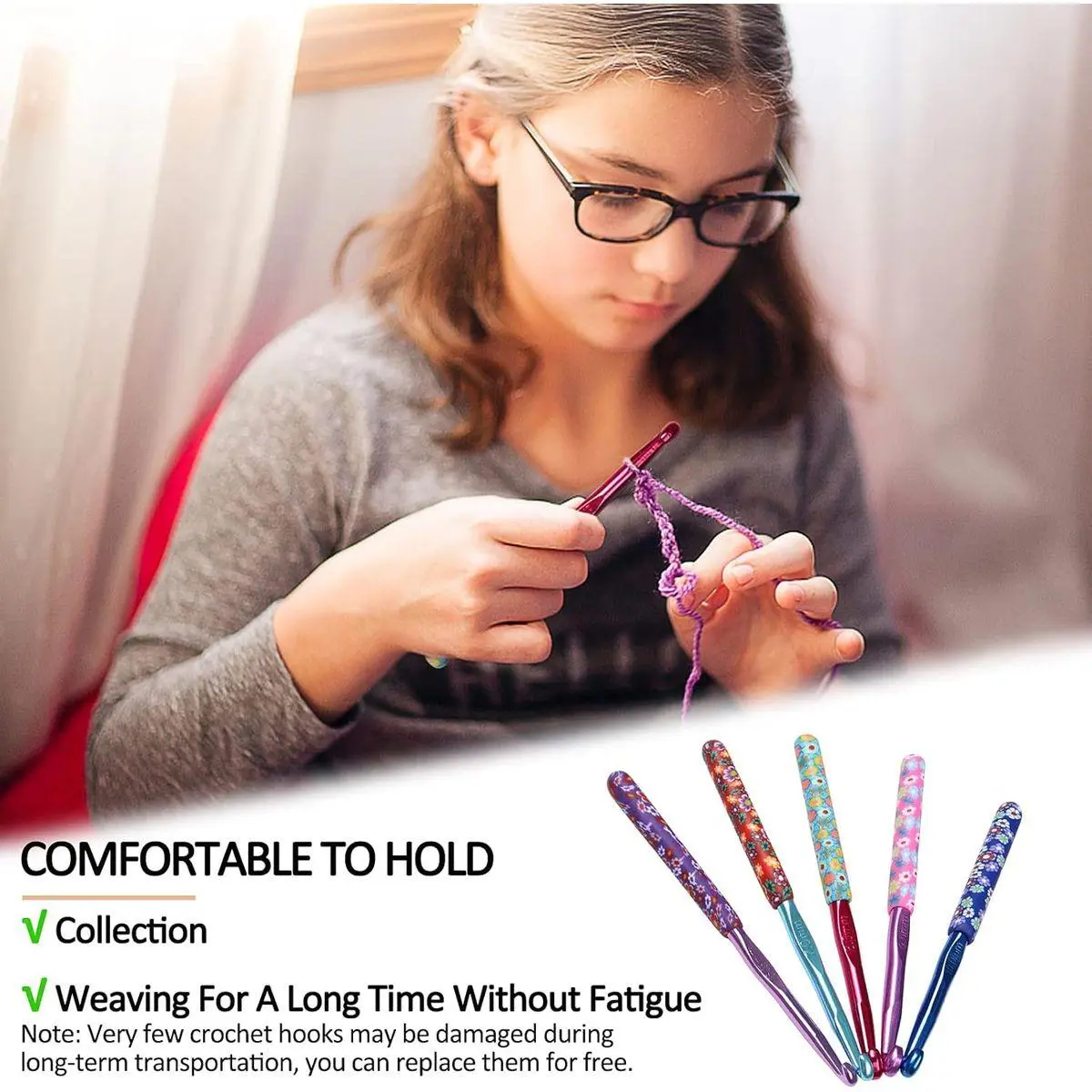 Pretty & Smooth Aluminum Hook, Easily Identify Size: The crochet grip pattern adopts beautiful flower series patterns. Our crochet hook set have smooth hook, which don't catch on the yarn or splitting the yarn. Making the crocheting process more efficient and comfortable. Multicolor crochet hooks needles, different colors match different knitting needles size. Every hook is marked with numbers and Letter, so you’ll never be confused