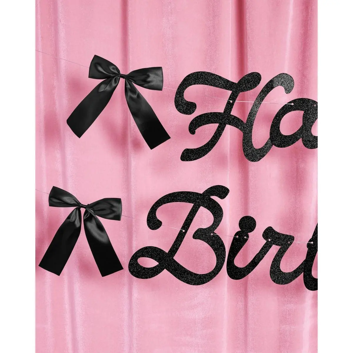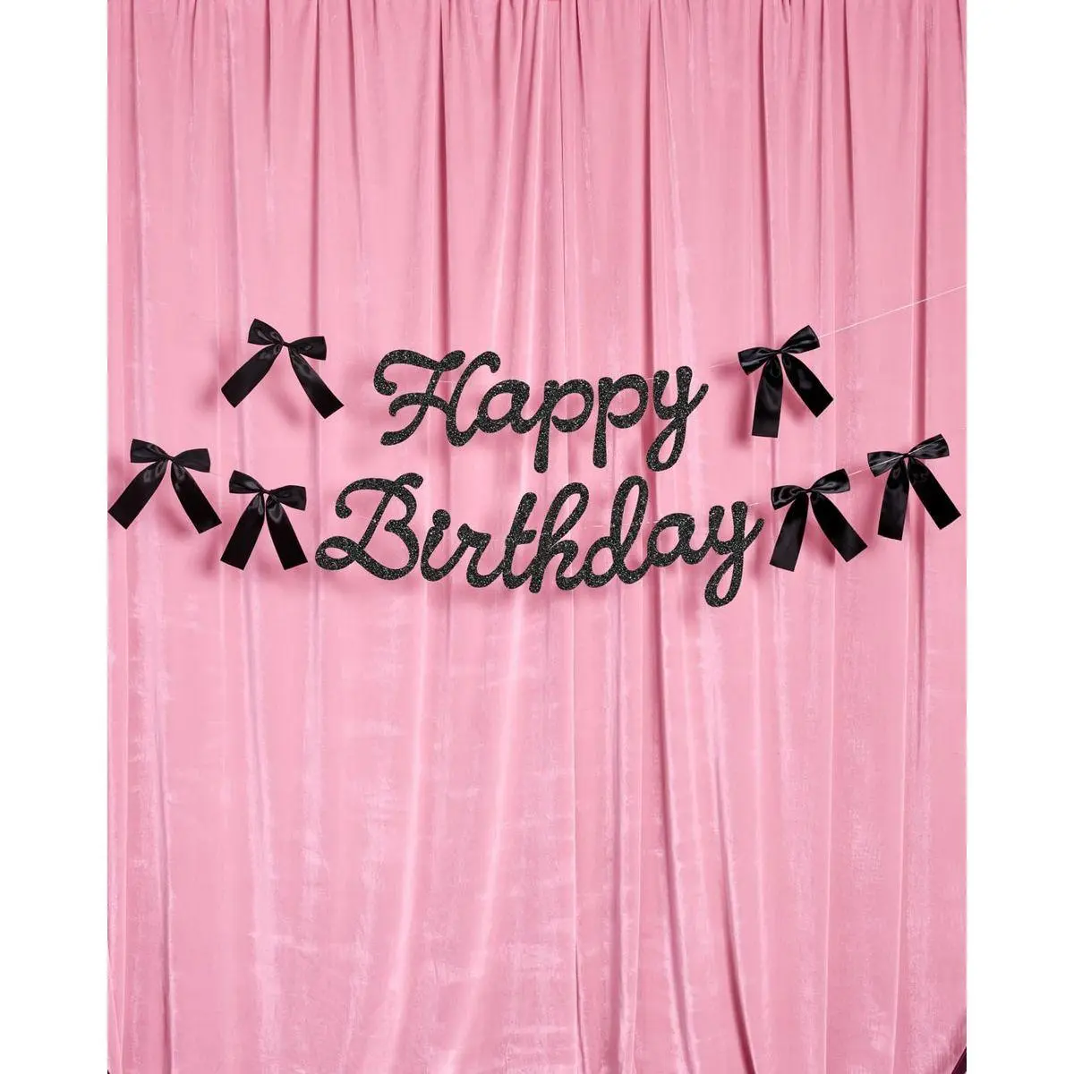 Included Components: Black Glitter Birthday Banner, 6 Black Satin Bows, 2 Silver Strings