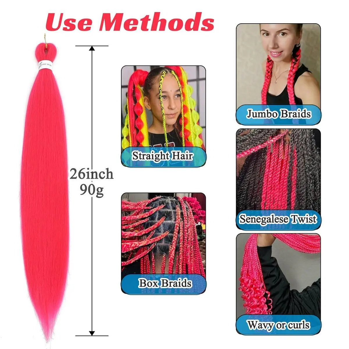 【Hair Material】100% Natural hot pink pre stretched braiding hair made with high quality low temperature synthetic fiber, creat a natural look. light and comfortable, soft feel like real human hair.