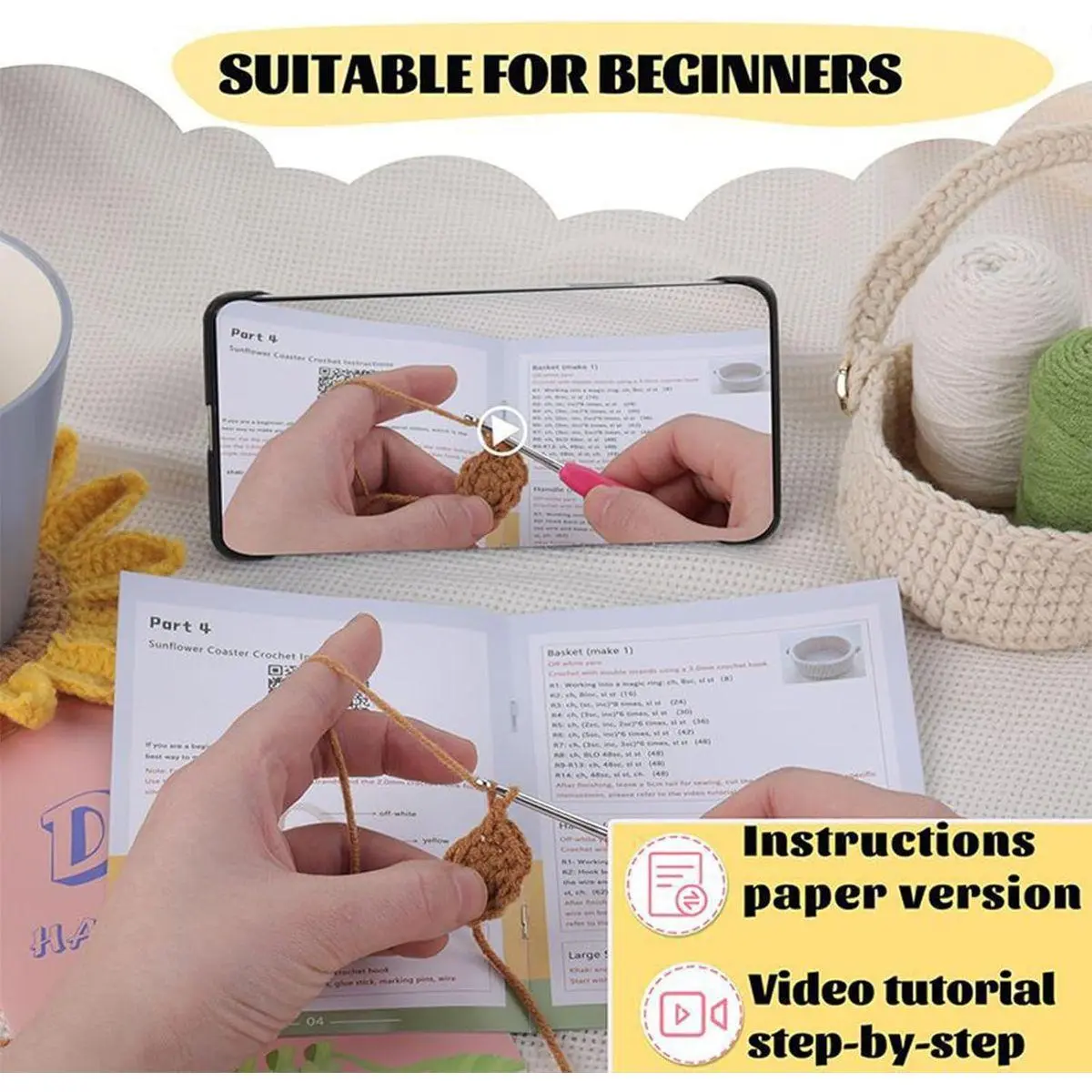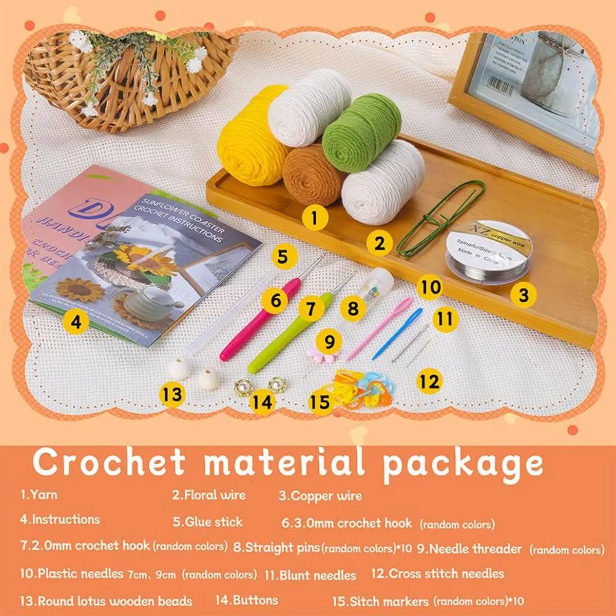 The perfect beginner crochet kit: Our crochet kit includes all the materials needed to make 5 coasters. Contains high-quality yarns of different colors, crochet hooks (2.0mm, 3.0mm), sewing needles, straight needles, hot melt glue sticks, positioning buckles, threading tools, buttons, wooden beads, instructions, and all the materials needed.