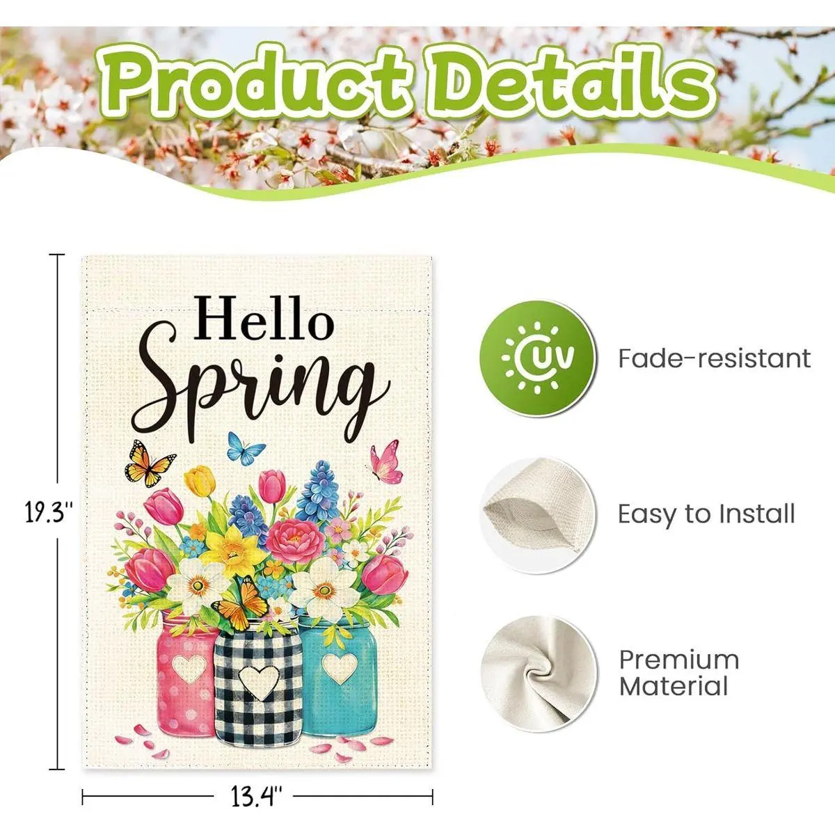 Hello Spring Garden Flag: Crafted from 100% machine-washable spun polyester, this Hello Spring Garden Flag offers long-lasting durability for outdoor display. Reinforced double stitching on multiple rows and a high-quality sleeve ensure strength and fade resistance in all seasons—an ideal spring garden flag for everyday use.