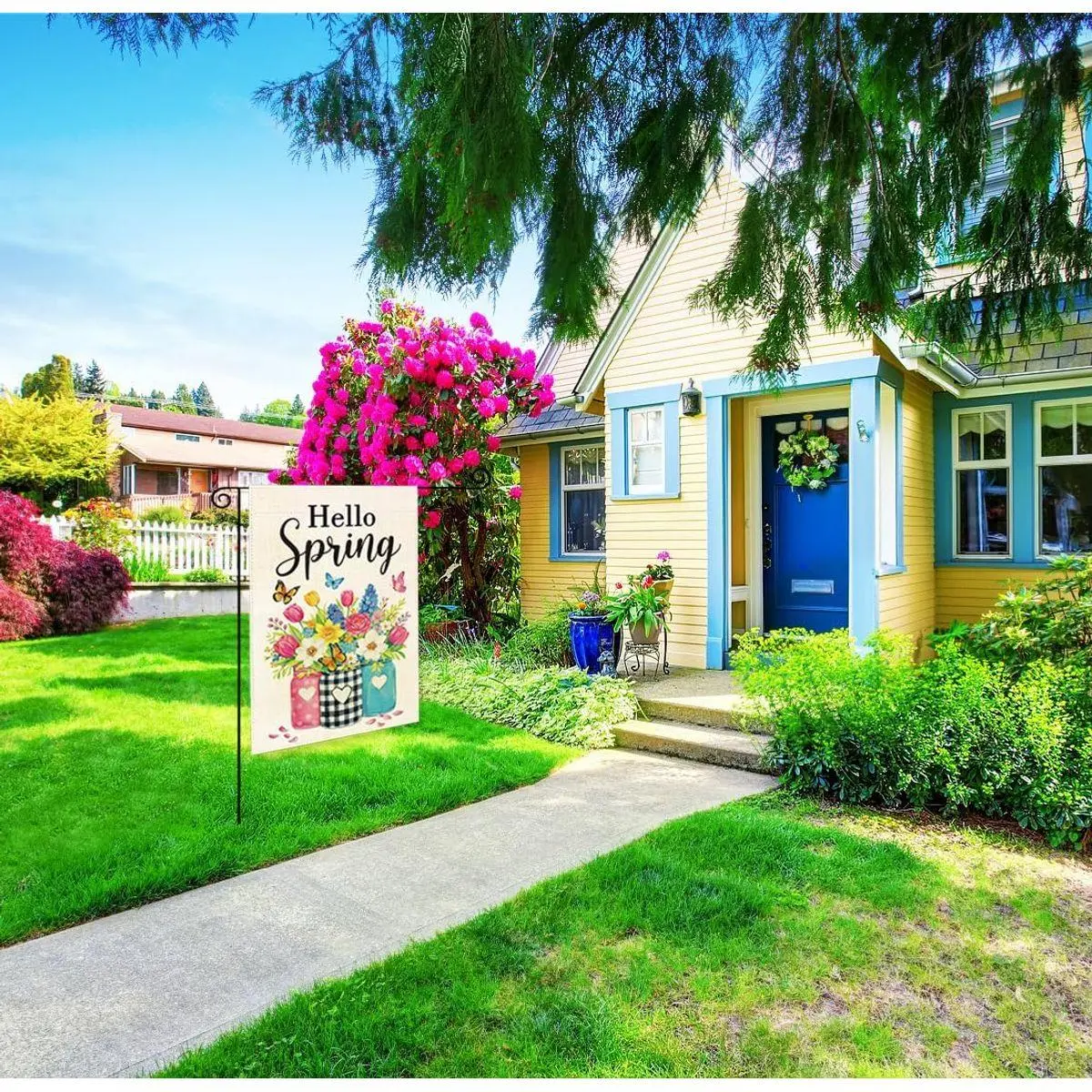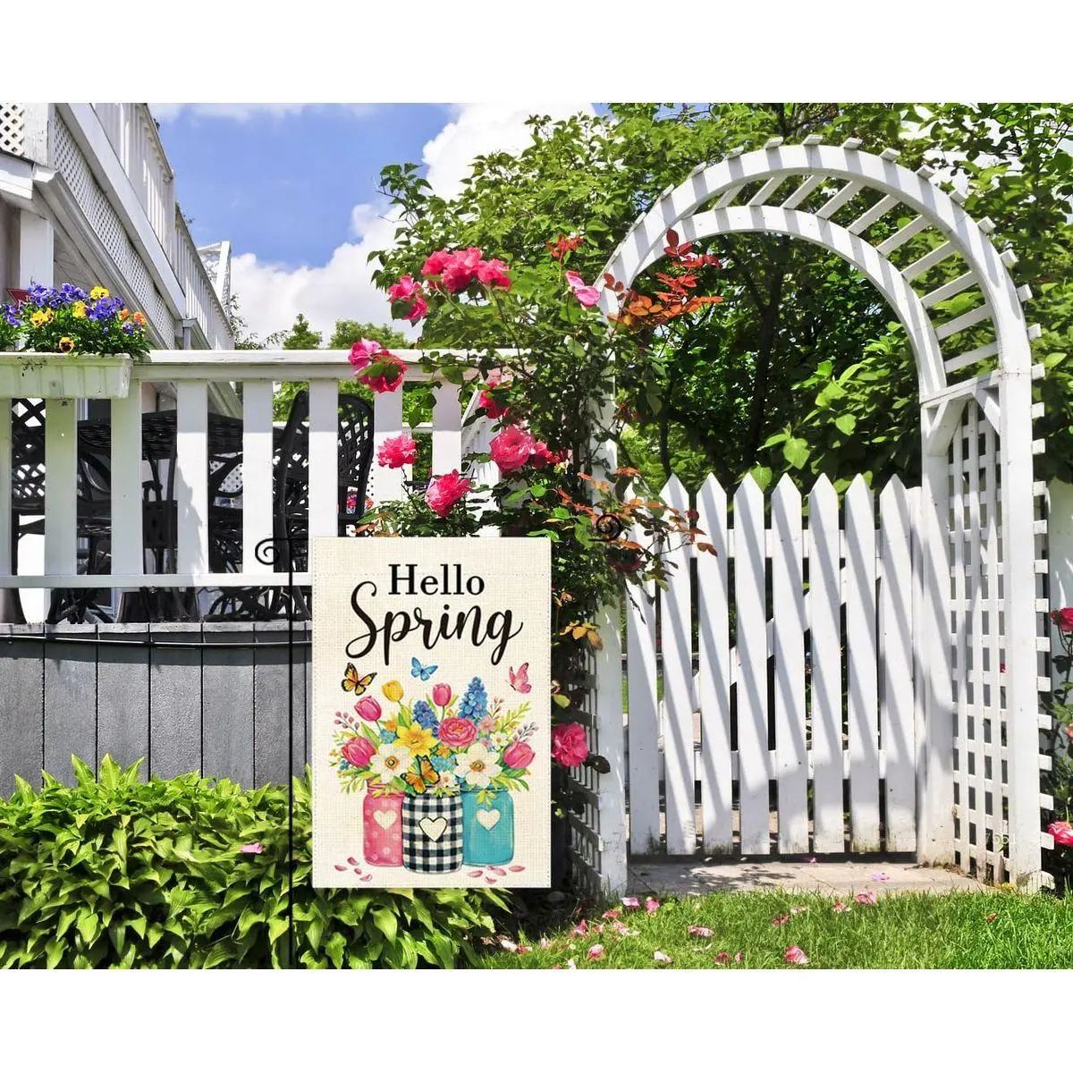 Spring Home Decor: Welcome guests with this stylish flag that complements patios, porches, decks, and verandas. A lovely choice for spring home decor and coordinated spring porch decor, creating a cheerful seasonal statement.