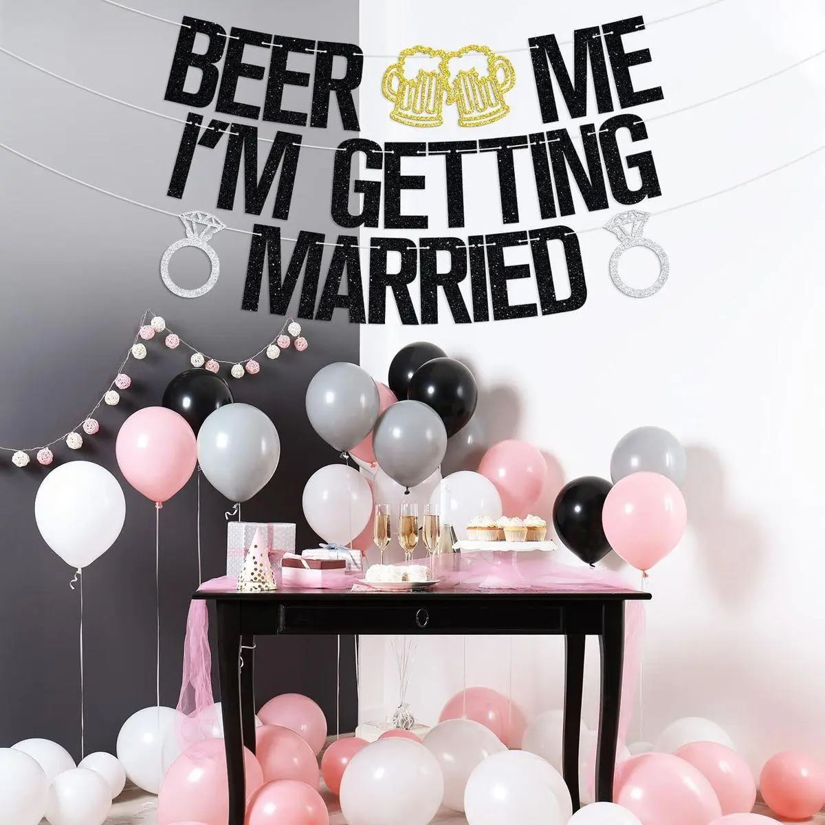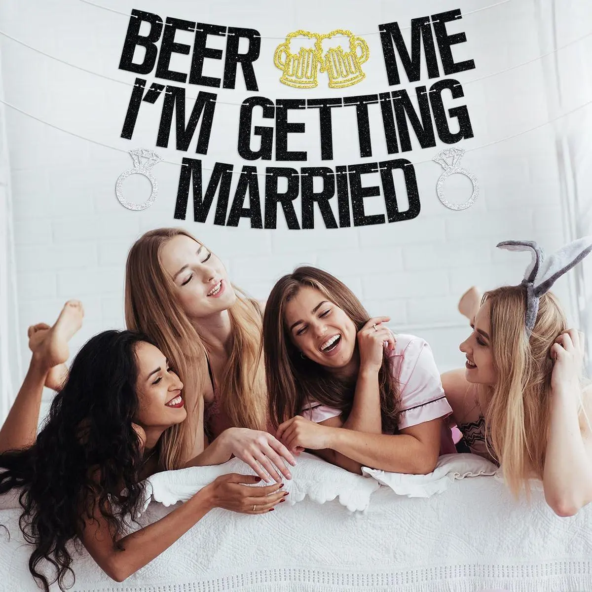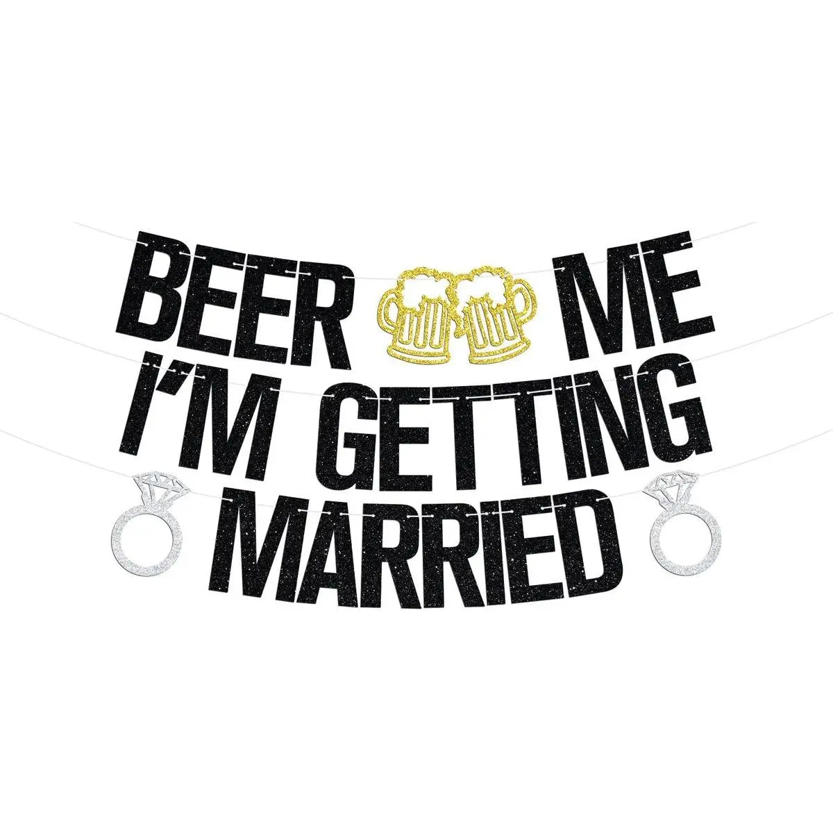 Package Contents: Includes black glitter letters of "Beer Me I’m Getting Married" with a little wedding ornaments, 3 strings and 1 plastic needle.