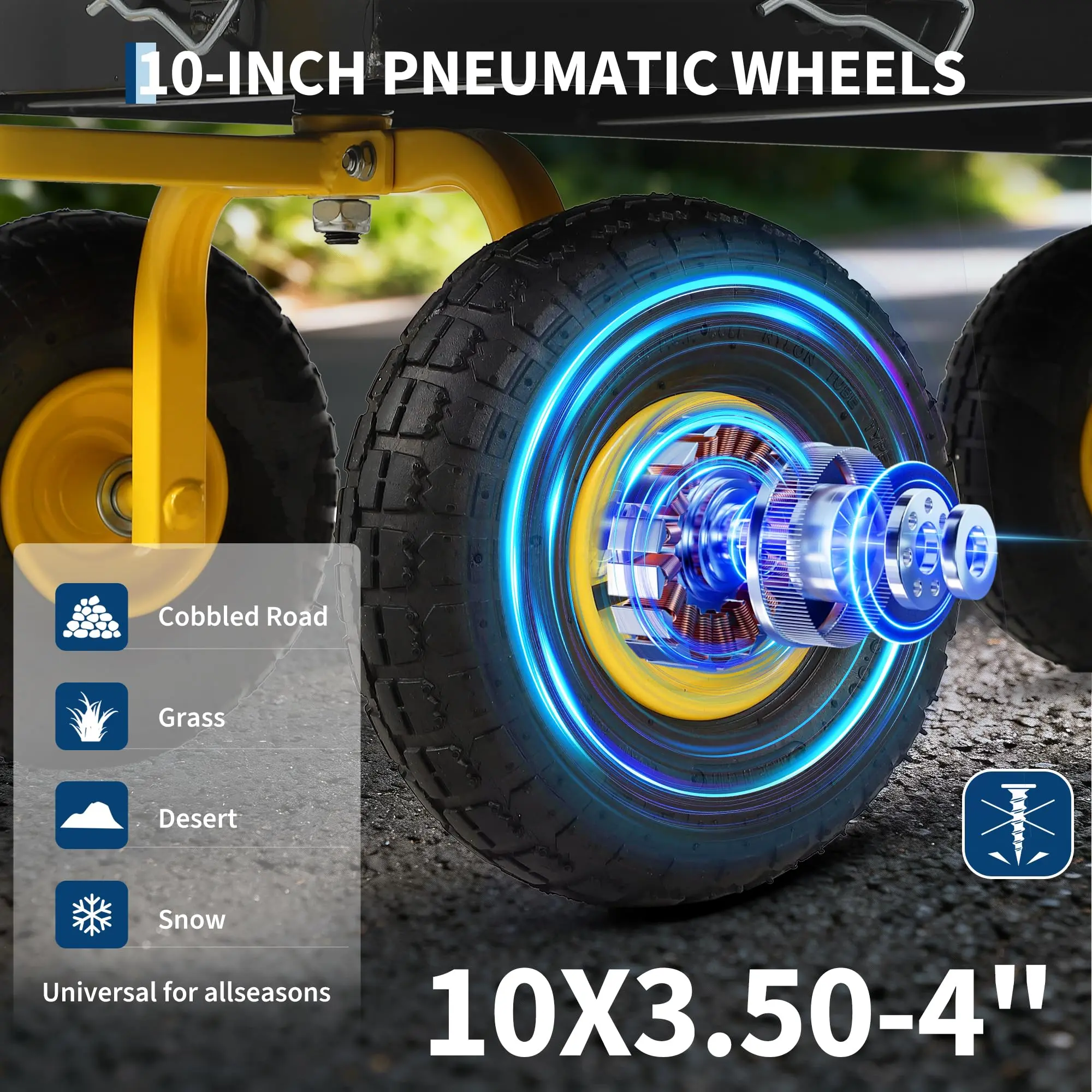 🛞 10 inch rubber tires with metal hubs roll smoothly across grass, mud, rocks, and snow