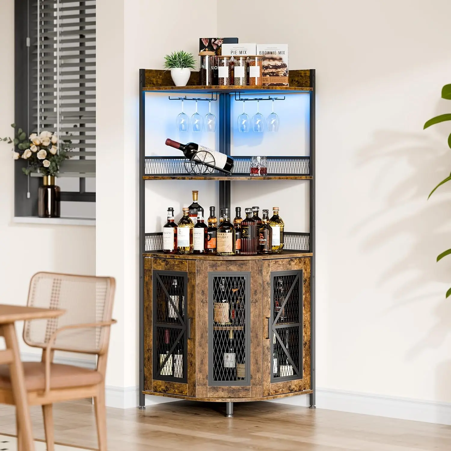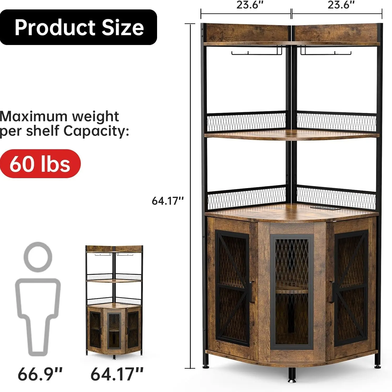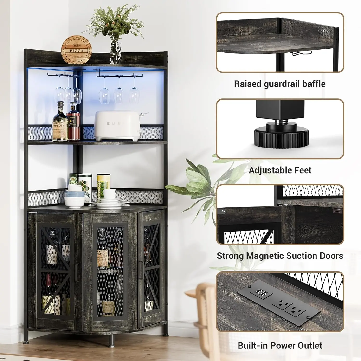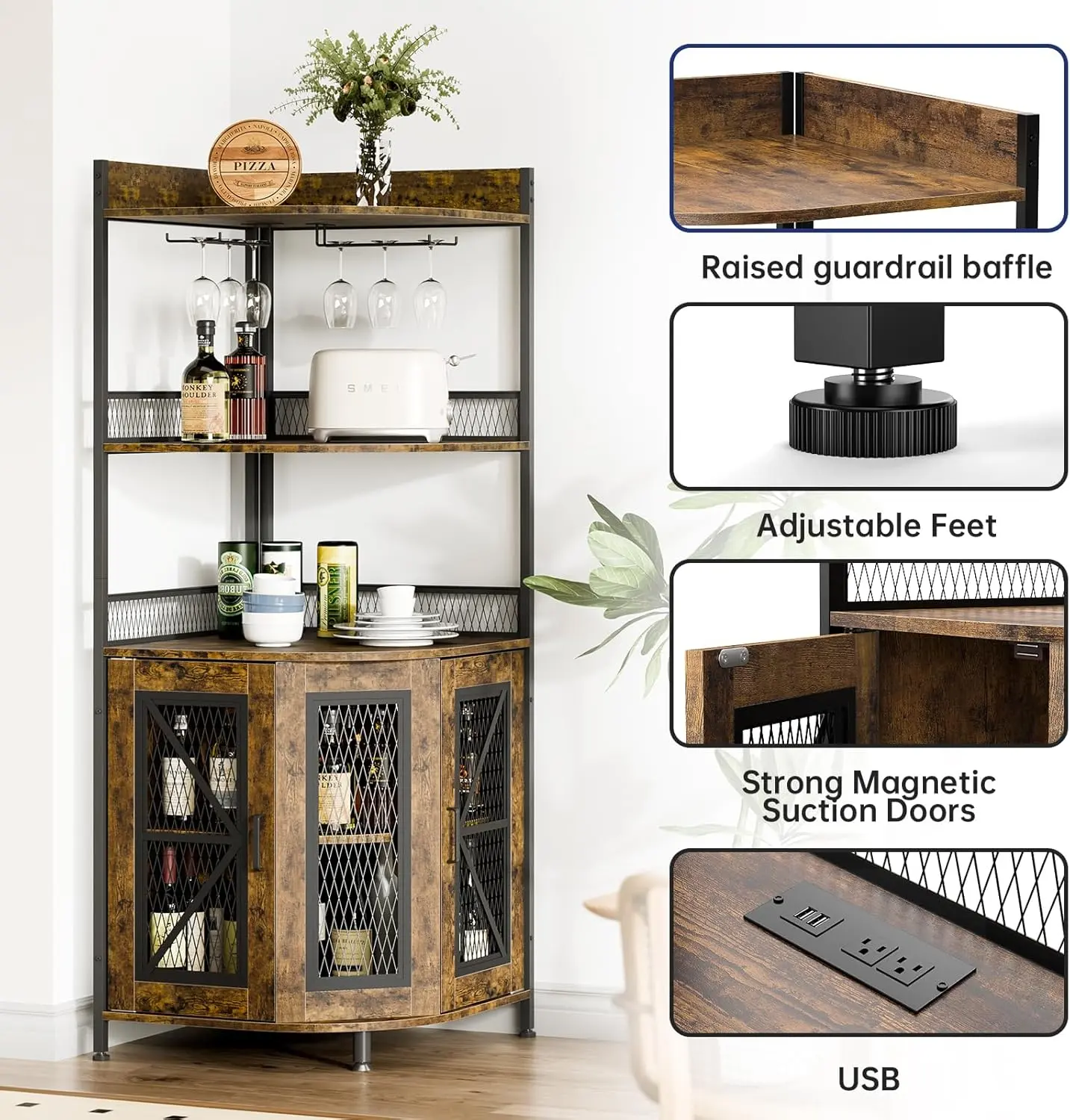 ·【Ample Storage for Wine & Bar Essentials】The 5-tier corner cabinet includes a wine glass holder, open shelves for bottles, and enclosed storage with adjustable shelves. Ideal for liquor cabinet bar for home setups, it organizes everything from whiskey collections to coffee bar cabinet appliances.