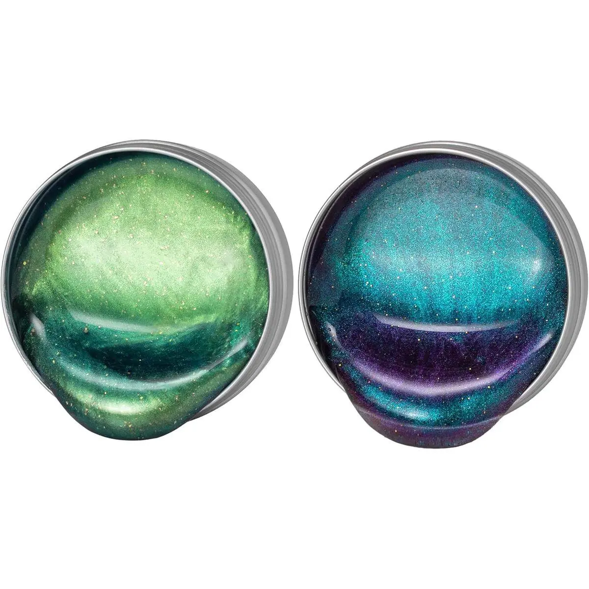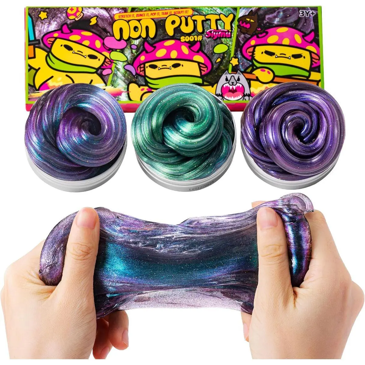Colorful green and purple, colorful green and gold, colorful blue and purple three-color models, satisfy you who love colorful colors in one set After multiple stretches, it can change color and present a metallic silver luster Non-Newtonian fluid, the hammer cannot be smashed, and it is stretched gently, which is especially suitable for training creative thinking over the age of 3 years old Metallic Stretch, Crispy Snap Texture, ASMR Sound Contains 1.4 oz*3 Slymu putty and mixed shiny accessories,Non-Toxic Slime, ASTM Certifie