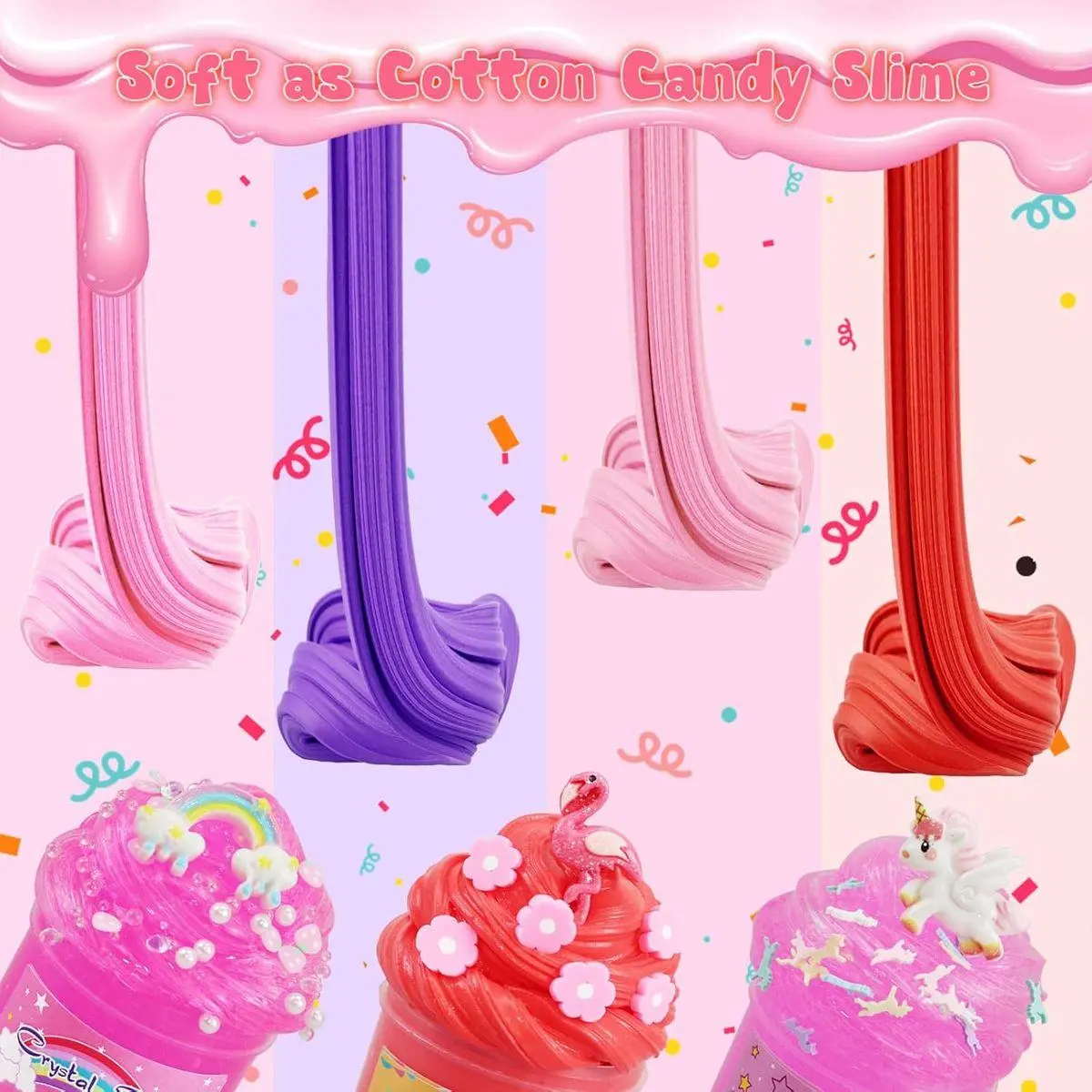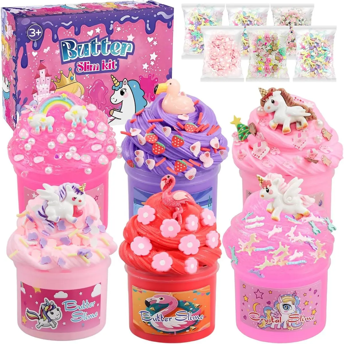 🎁【6 Pack Slime Kit】This butter slime for kids includes a variety of slimes with distinct textures and colors: 2 packs of pink crystal slime, 2 packs of pink butter slime, 1 pack of purple slime, and 1 pack of red slime. The 6 containers are accompanied by a range of accessories: 3 delicate unicorns, 1 flamingo, 1 swan, and 1 rainbow-shaped star decoration. Children can enjoy the fun of non-sticky, fluffy, and soft slimes simultaneously!