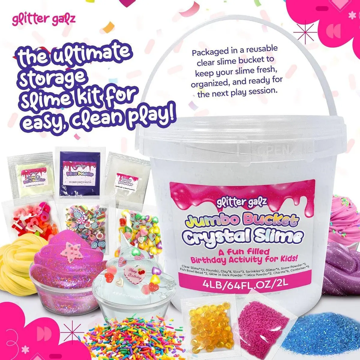 Mess-Free Storage Solution: The slime ingredients come in a reusable clear slime bucket to keep your slime fresh, organized, and ready for the next play session. Easy cleanup and storage make our big slime bucket convenient for both kids and parents to enjoy again and again.