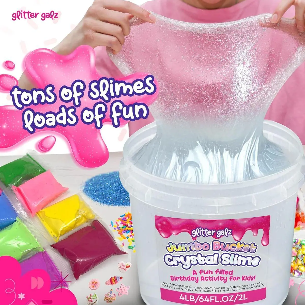 Big Bucket Slime Supply for Shared Fun: The Glitter Galz clear slime bucket is packed with a full 2 lbs of crystal clear slime. It’s perfect for group play, party games, or classroom activities. A fun and easy way to keep your kids and their friends entertained for hours.