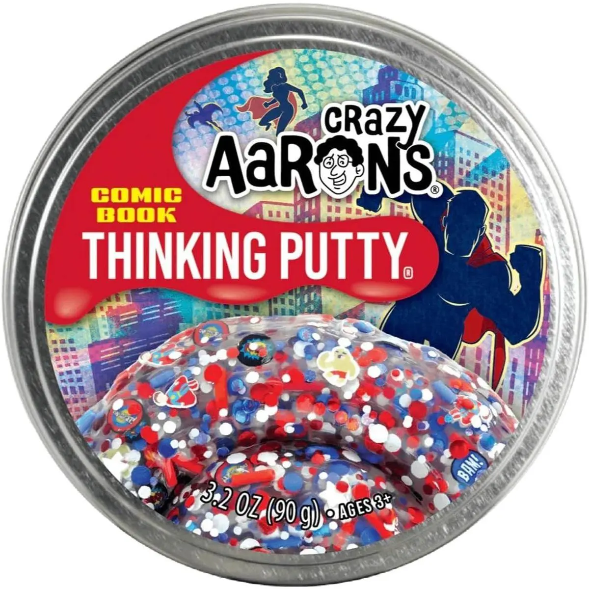 NON STICKY PUTTY: Dive into the world of superheroes with Crazy Aaron's Clear Thinking Putty, adorned with comic book character pieces, vibrant red, white, and blue glitter, and clay sprinkles for an action-packed sensory experience.