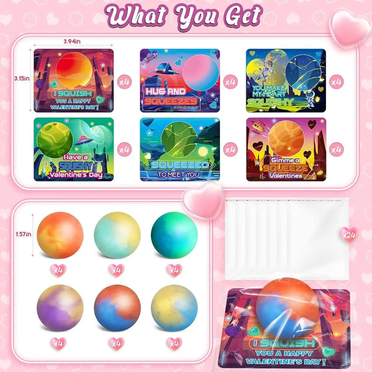 【Kids Valentines Day Greeting Cards】Our valentines day super values set included 24 valentines day cards in 6 unique designs and 24pack unique stretchy stress ball with different colors. Each valentine day slime ball with 2 colors. Kids and teens will love these valentine day cards. Perfect for kids valentines day gifts.