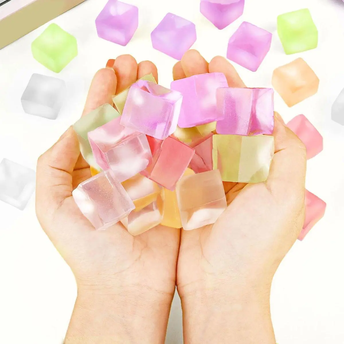 Easy to Take: Each ice cube stress ball measures approximately 0.98 x 0.98 x 0.78 inches, delicate and exquisite, which is easy to take with you in any settings. Whether you're in the classroom, office, on the go, or on a plane, you can squeeze these cubes to relax your mind and body