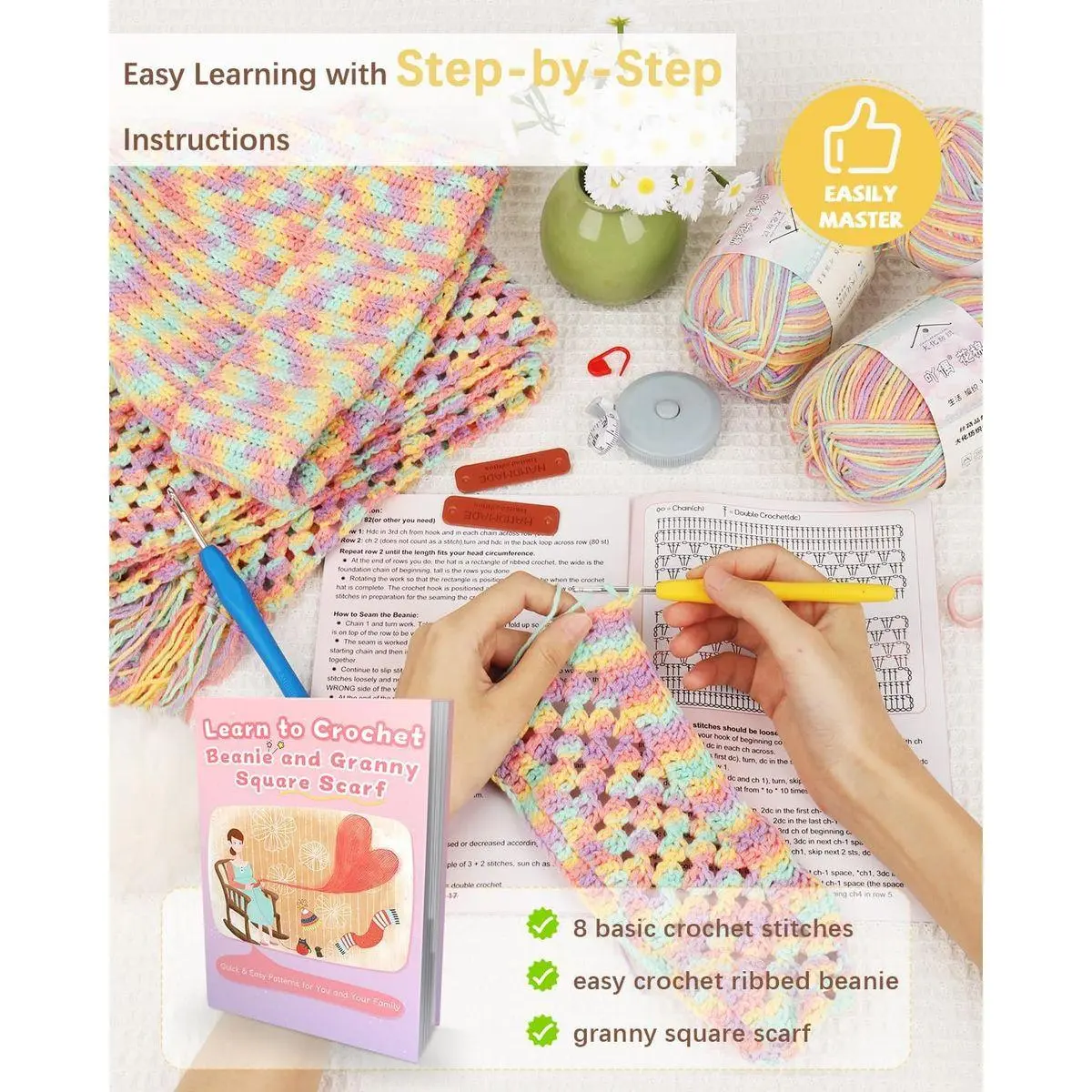 🔹How to Follow the Scarf Crochet Kit Instruction: The beginner crochet kit’s guide is structured in 3 sections: a basic crochet tutorial, beanie, and final granny square scarf tutorial. Crochet beginners are advised to start with the basic stitch tutorials, which cover foundation techniques like starting, add and subtract stitches, and finishing knots. Don’t let inexperience hold you back—follow the step-by-step instructions to craft a beautiful scarf with confidence!