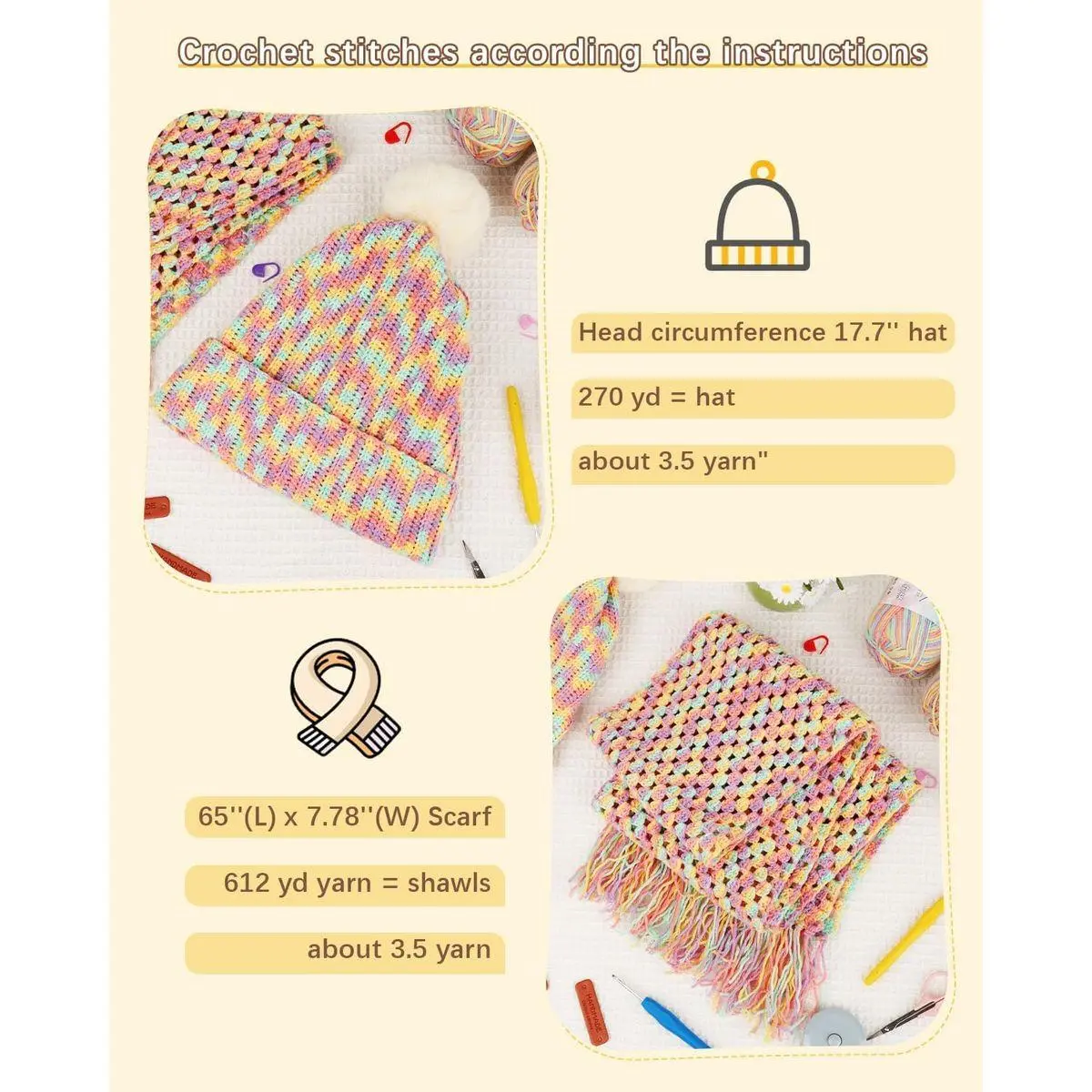 🔹A Wonderful Family-friendly Hobby, Relaxing & Rewarding while Learn New Skills: Crocheting reduces stress, improves focus, ideal for unwinding after a long day. Bond with family, friends, or fellow crafters while creating something handmade and meaningful together. After crocheting shawl, you will get a granny square hat scarf, and learned a new skill, you'll feel a great sense of accomplishment.