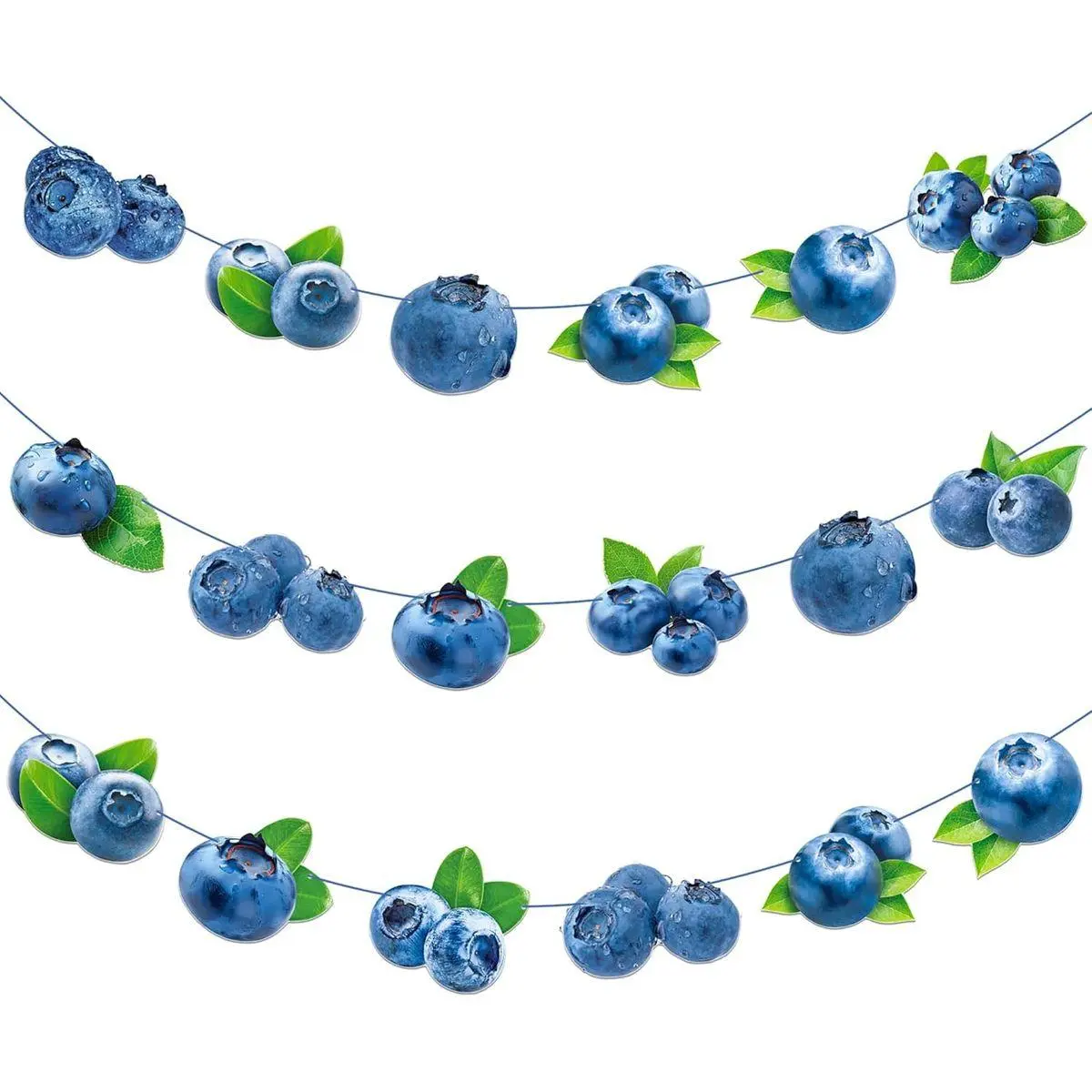 PARTY PACK: Set of 3 pre-strung blueberry-themed banner cutouts which are printed on both sides. Perfect for summer fruit celebrations and festive decorations