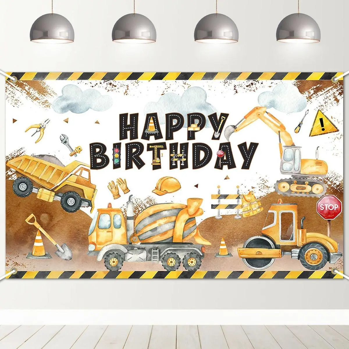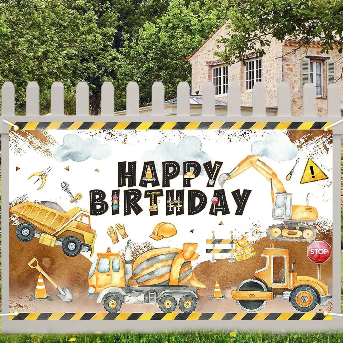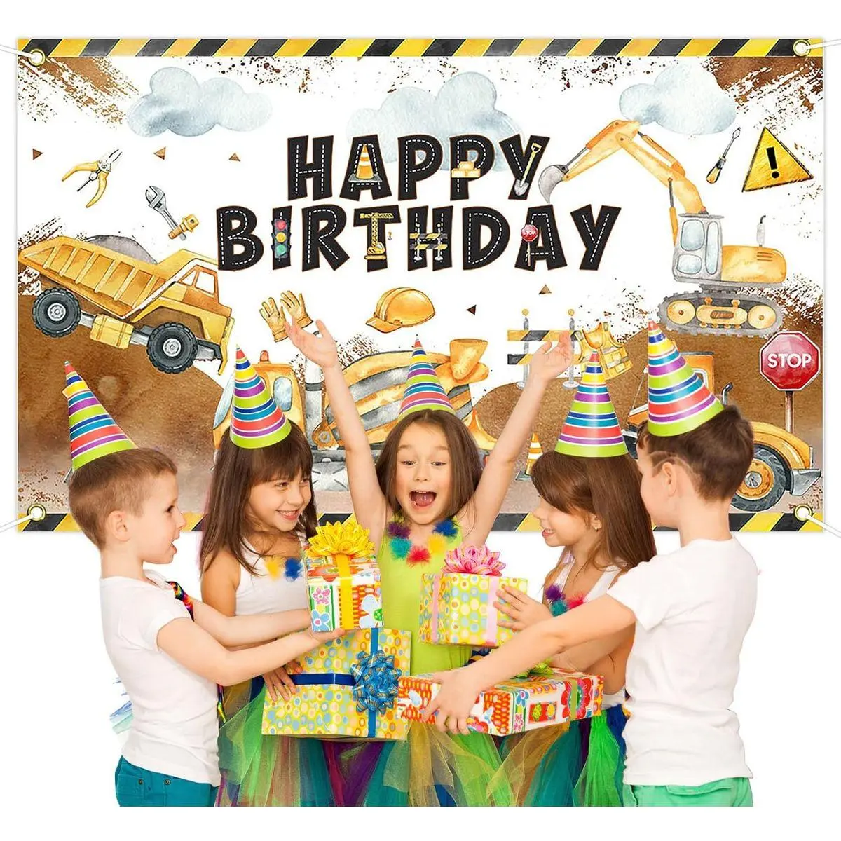 CELEBRATE IN STYLE: This bright and colorful construction birthday backdrop banner creates a festive backdrop for photographs; Made of high-quality polyester fabric that will maintain its vibrant colors even after repeated use, with string for easy hanging