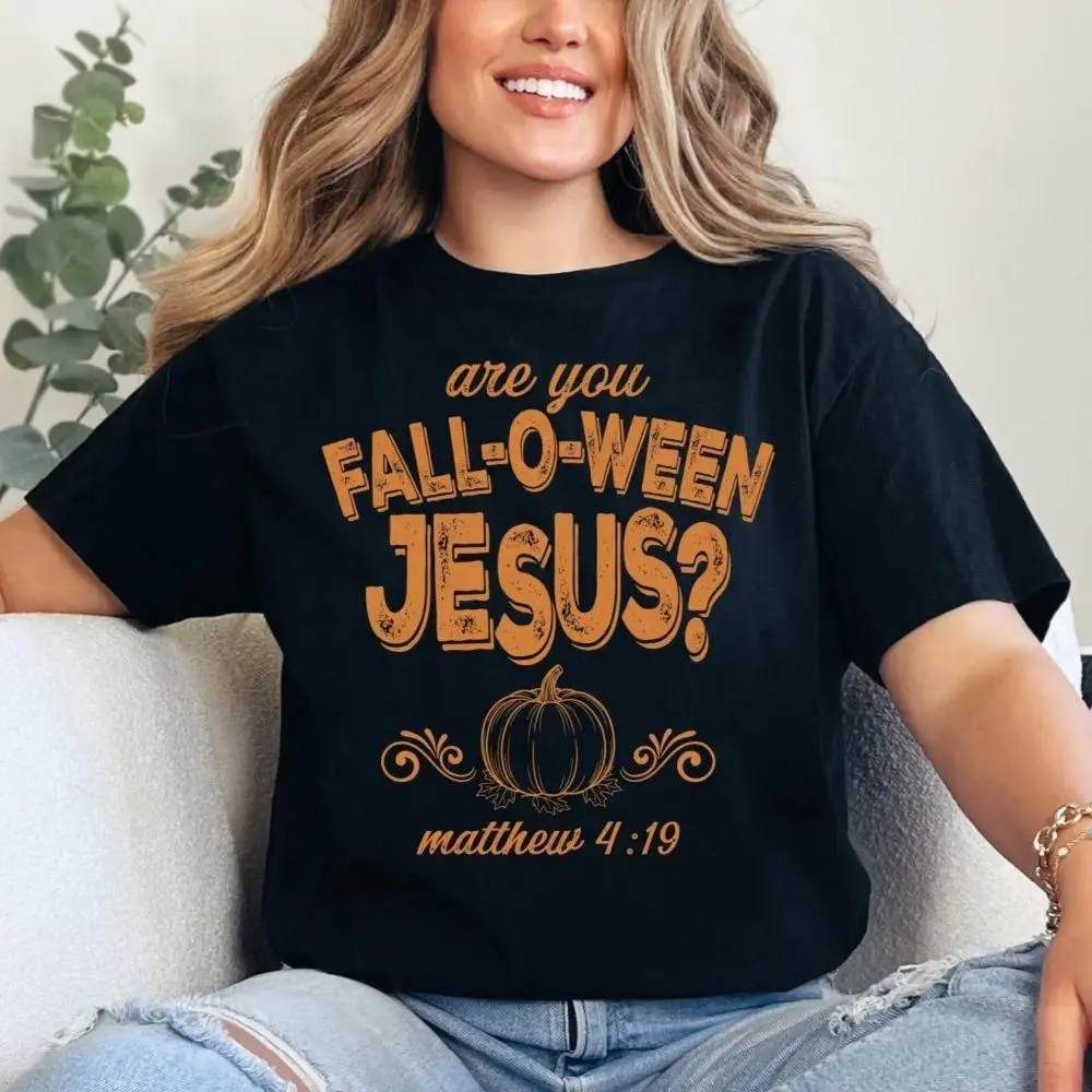 Unisex Fall Halloween Graphic Tee, Are You Fall-O-Ween Jesus Matthew 4:19 Print T-Shirt, Autumn Pumpkin Streetwear Top, Soft Breathable Cotton, Loose Fit for Daily Wear, Fall Outfit, Religious Thanksgiving Shirt