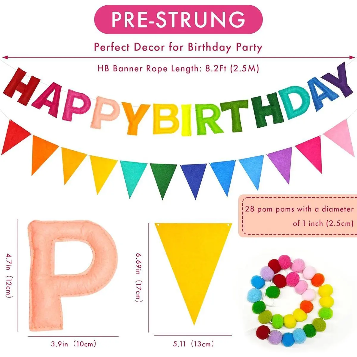 🌈[NO Assembly Required] Package includes HAPPY BIRTHDAY banner, felt ball garland, triangle pennants banner. Already pre-strung, no assembly required, just take them out and hang them up.