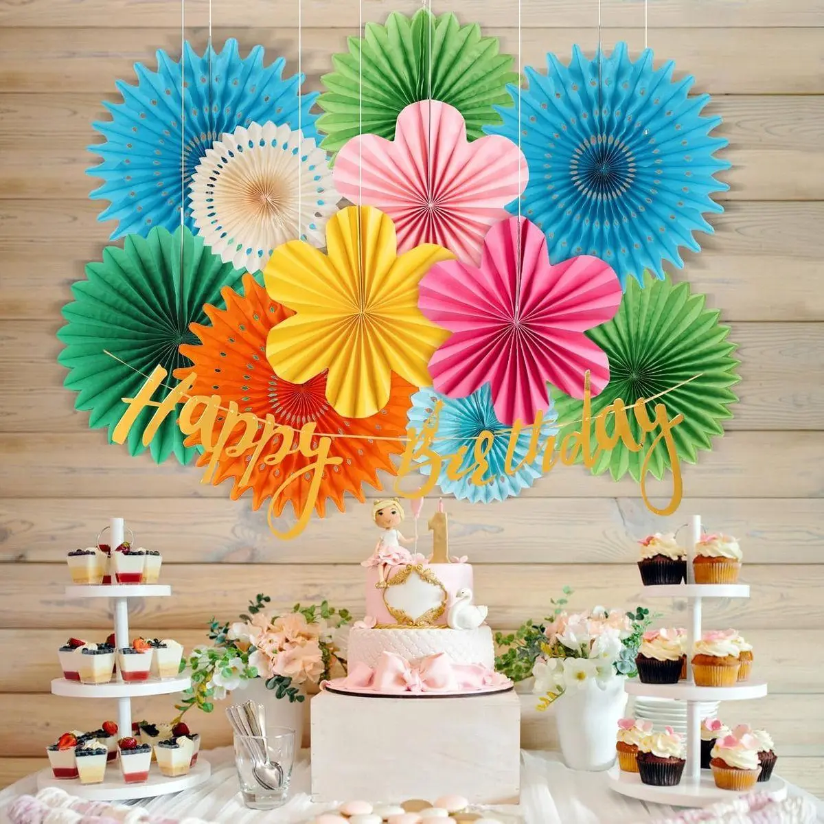 🌸Good colors and size: This birthday party decoration set combines everyone's favorite colors and sizes, mainly composed of pink, blue, and yellow flower paper fans. It can add cuteness and vitality to your party, creating a pleasant and unforgettable atmosphere.