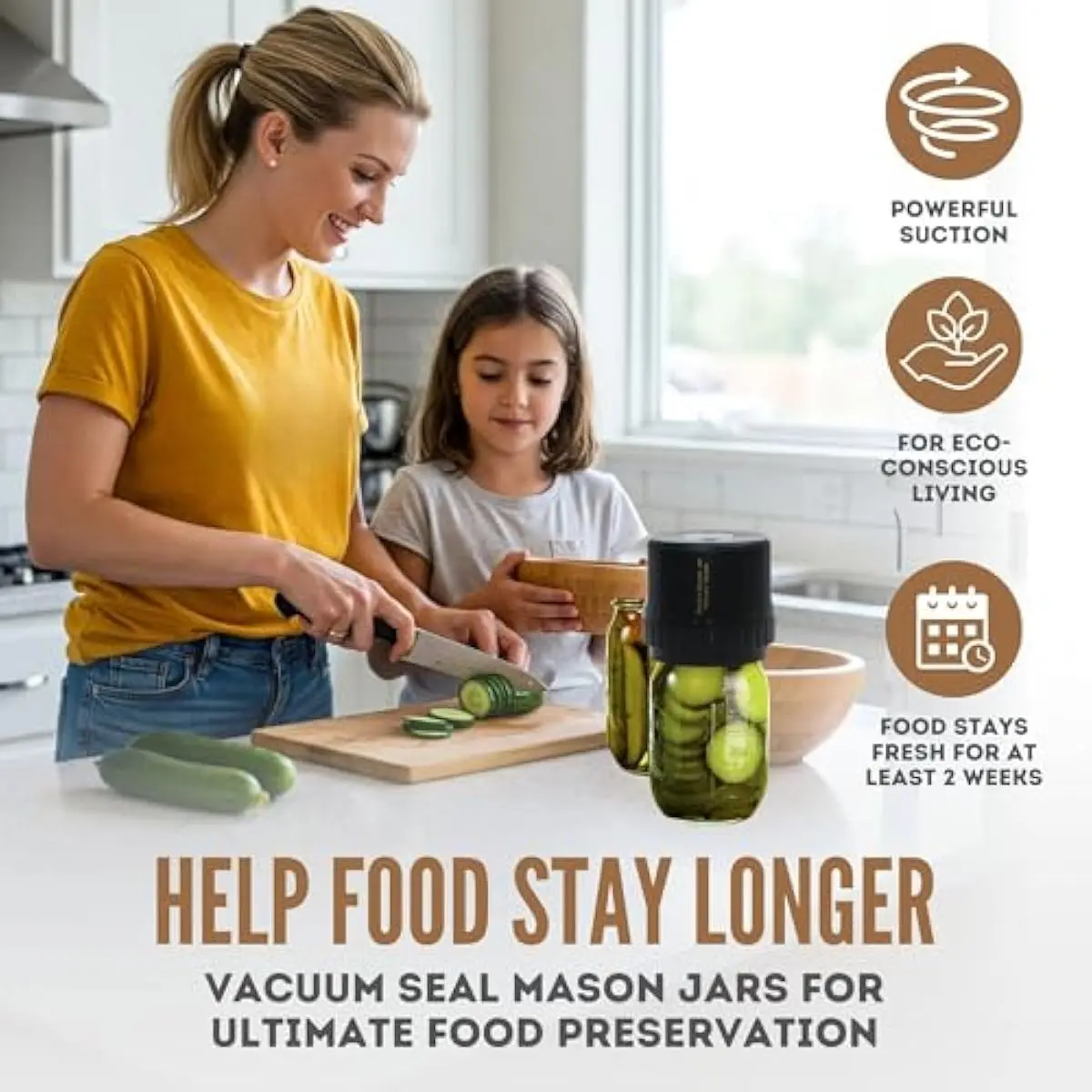 EFFORTLESSLY PRESERVE FOOD FRESHNESS: Vacuum seal mason jars with a powerful -60kPa suction system to keep your food fresh for weeks. Ideal for preserving fruits, pickles, jams, nuts, dried goods, and even liquids.