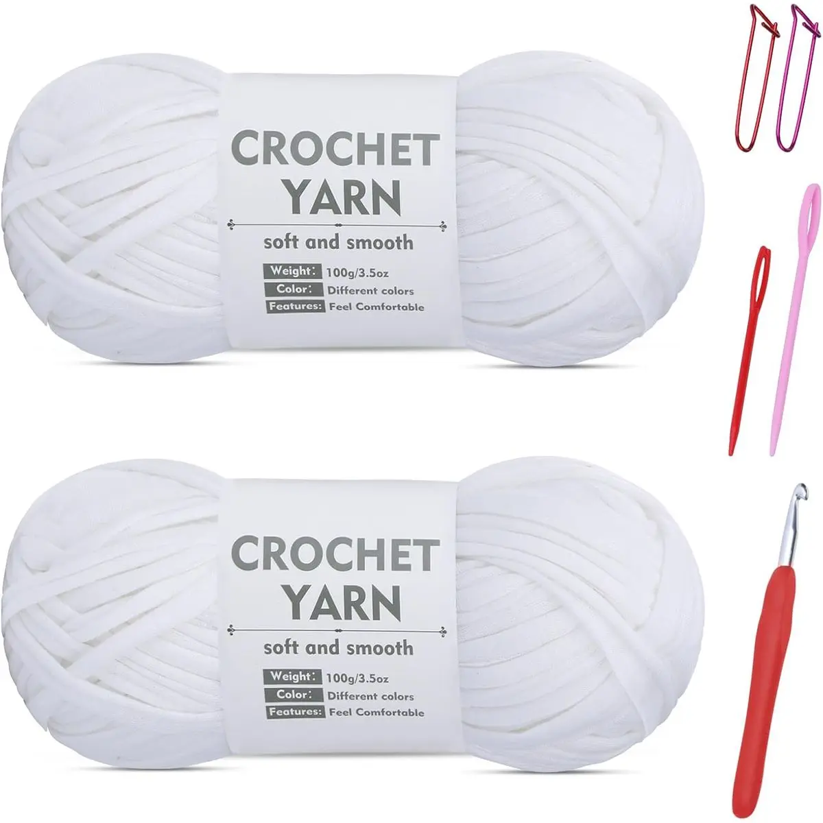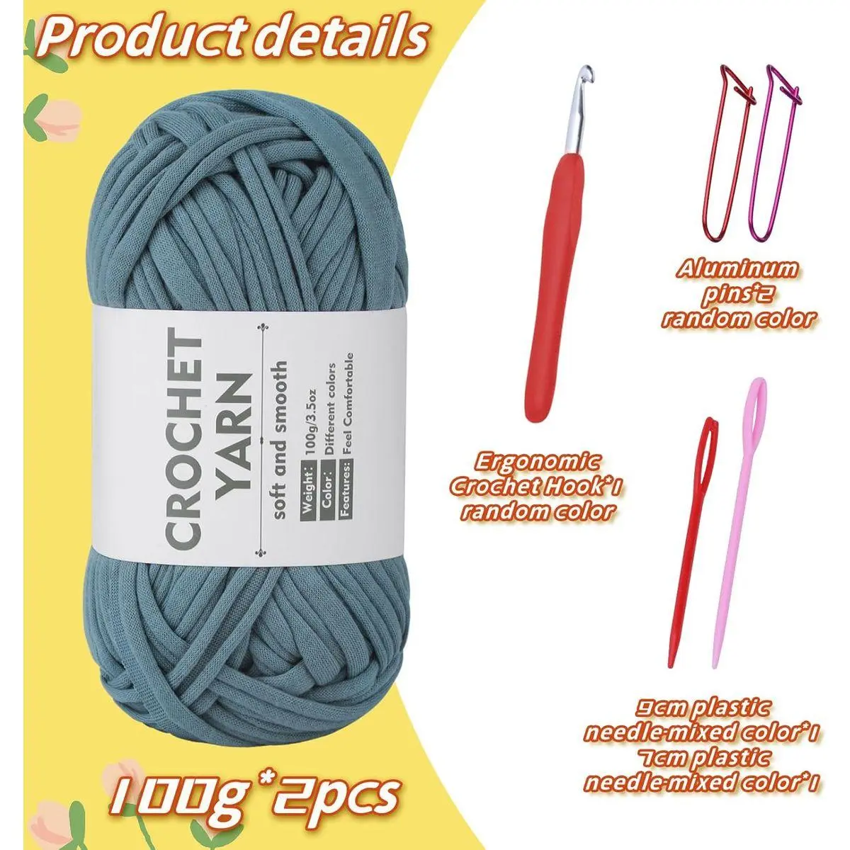 Included Components: 2 rolls of gray blue t-shirt yarn, 2 plastic large eye needles, 6.0 mm aluminum crochet hook with a rubber handle, 2 aluminum marker buckles, and matching tools for knitting
