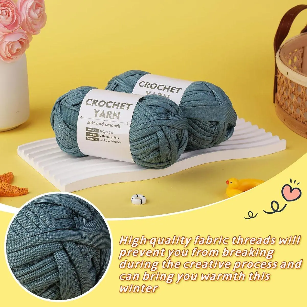 Crochet T Shirt Yarn: The package contains 2 rolls of gray blue t-shirt yarn, two plastic large eye needles, 6.0 mm aluminum crochet hook with a rubber handle, and 2 aluminum marker buckles. This set can meet your basic needs