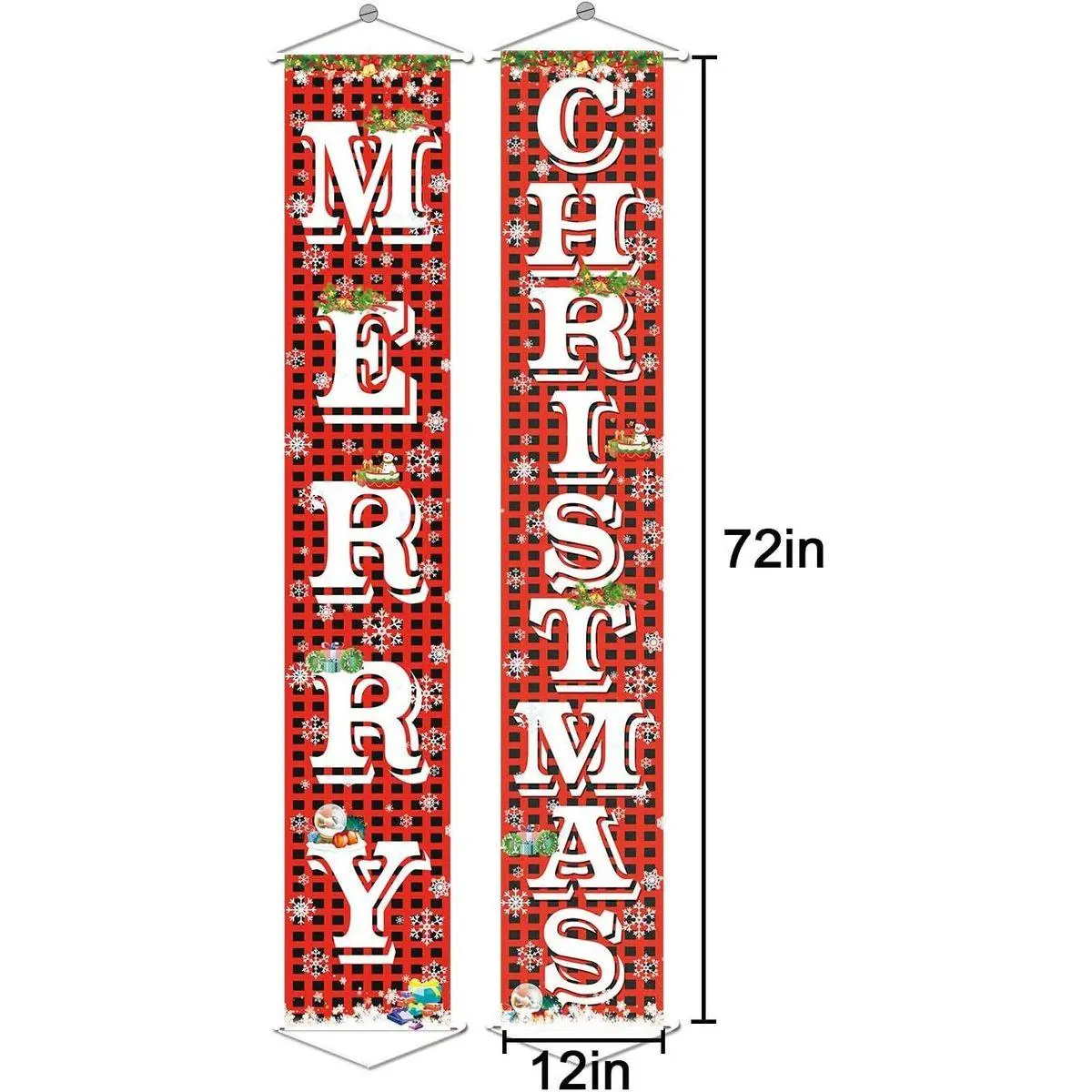 Size: one package include 1 pair of porch sign: 1 x MERRY banner, 1 x CHRISTMAS banner. each banner with hang rope. So it is very to hang! Each Flag banner size is 72 inchx12 inch.