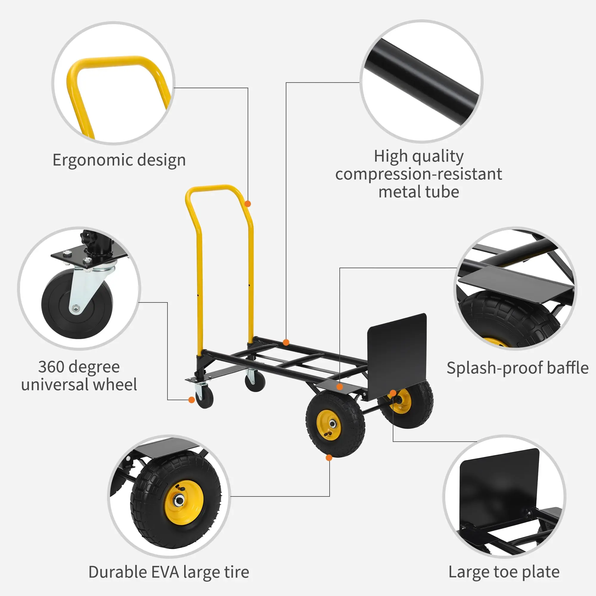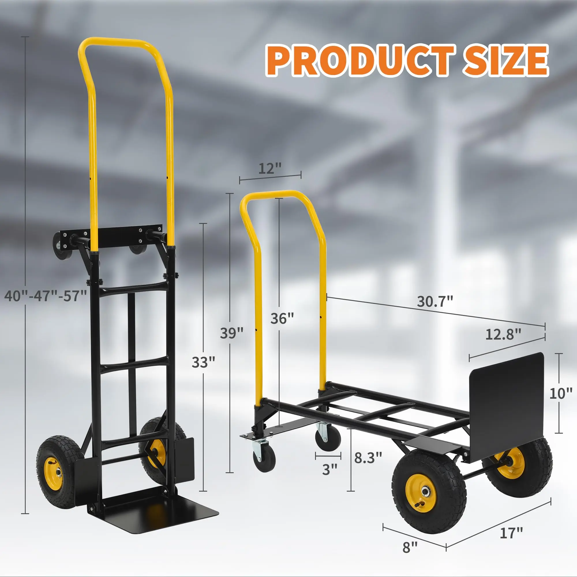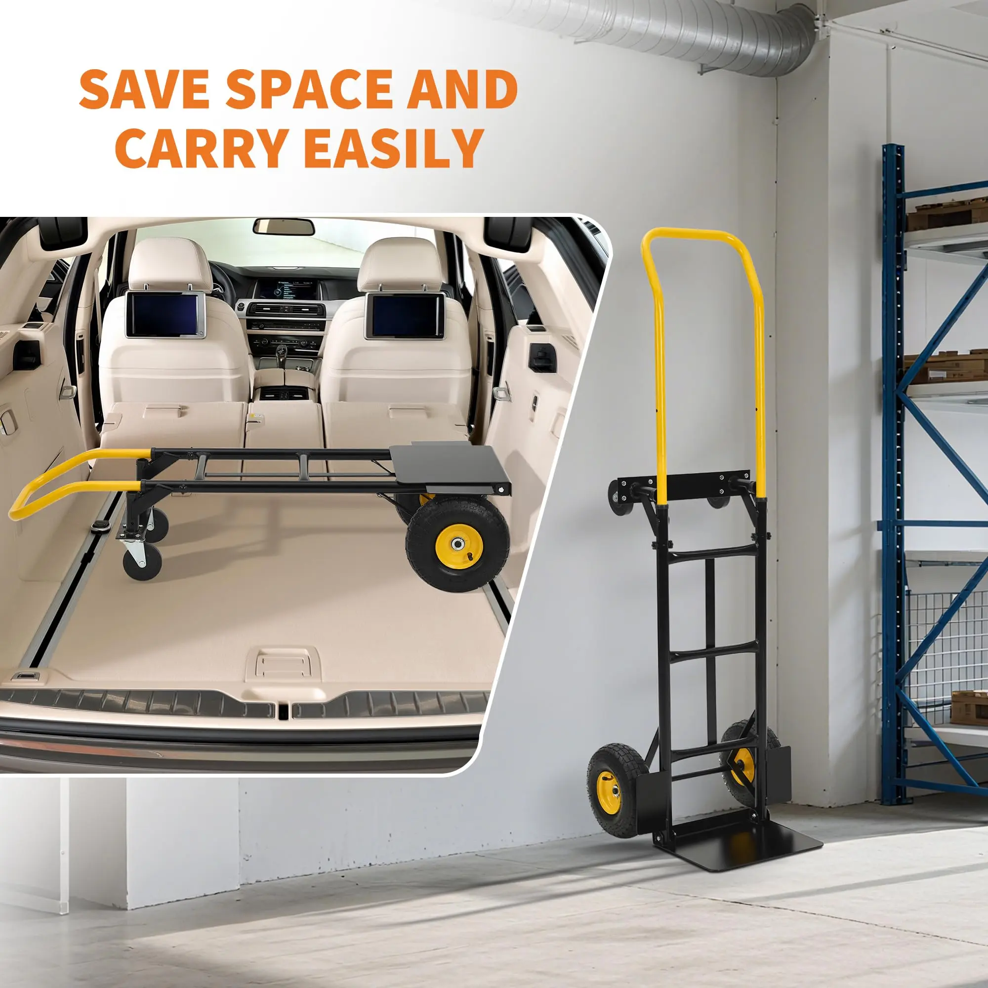 🛒 This 2-in-1 convertible hand truck quickly changes from a 2-wheel hand truck to a 4-wheel platform truck for flexible heavy-duty moving indoors and outdoors.