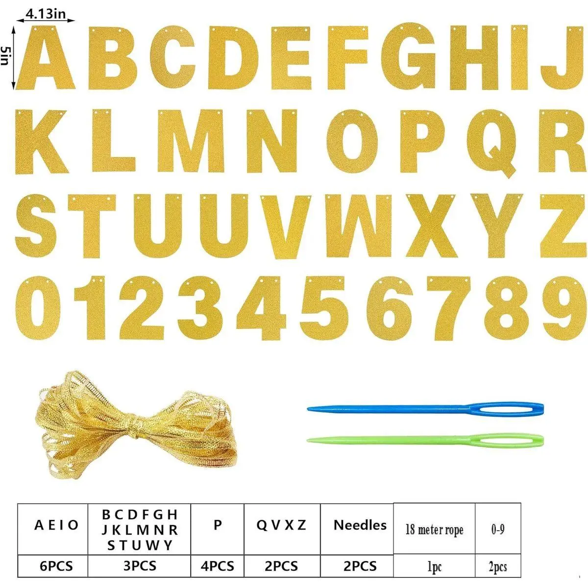110PCS CUSTOMIZABLE BIRTHDAY BANNERS KIT: You will get 107pcsglitter letter and numbers, 1pc 18 meter gold rope and 2pcs needles in total. Each gold glitter letters is about 5inch in height and 4inch wide as shown in the picture, suitable size and sufficient quantity for you to use for graduation party, wedding, wedding decoration.