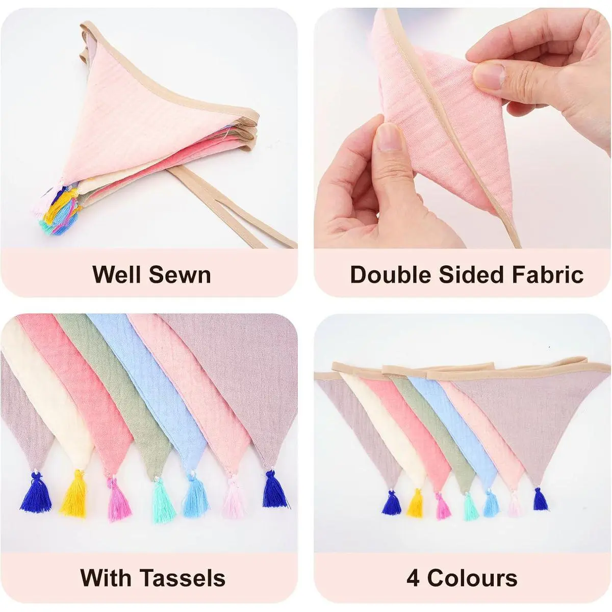 Cotton Fabric Triangle Banner: This triangle pennant banner is made from soft wrinkled cotton fabric, offering a natural and comfortable feel. Soft and drapery fabric, fine workmanship, strong and sturdy, and can be washable and reusable. The party banner complements boho nursery decor, kids' rooms, and indoor party spaces
