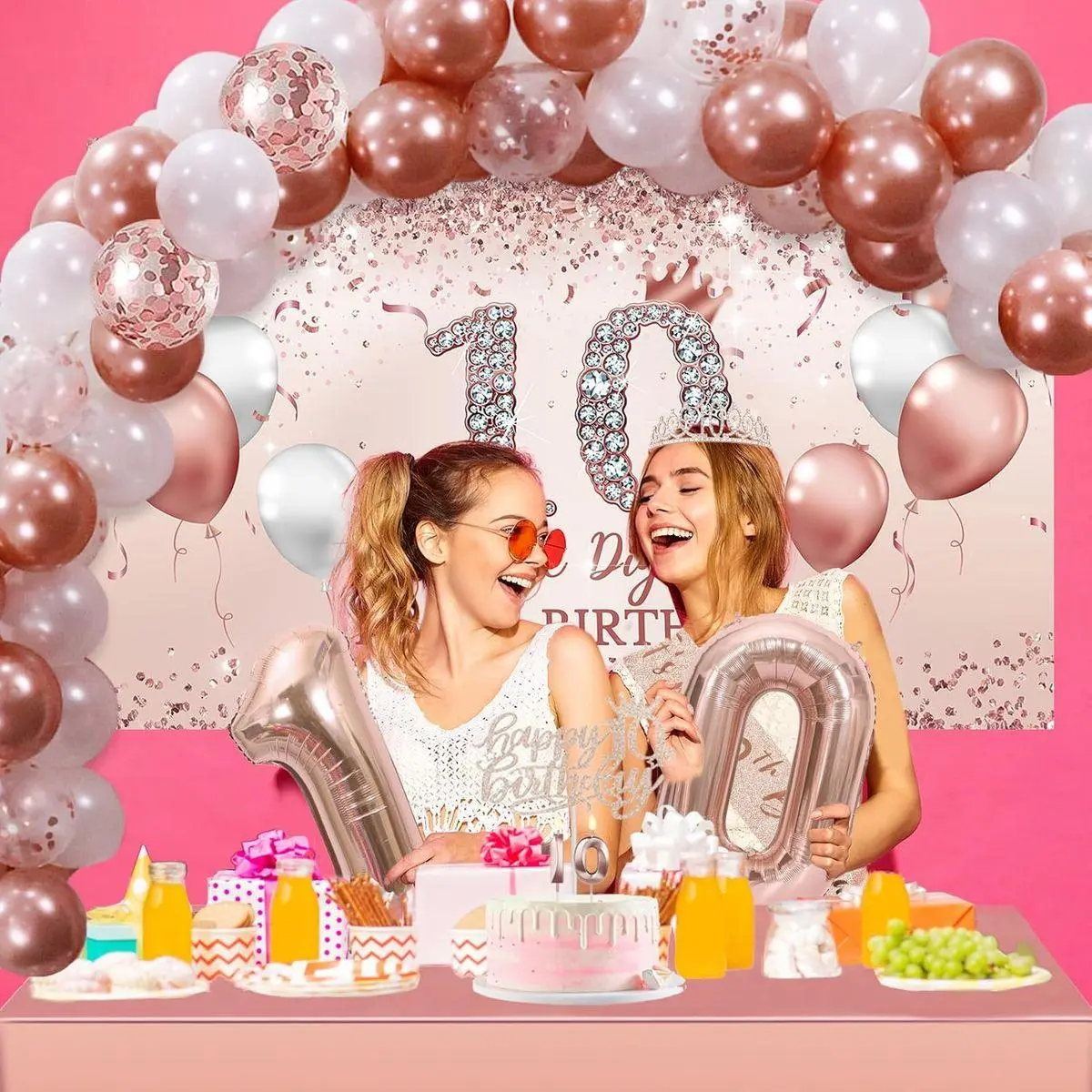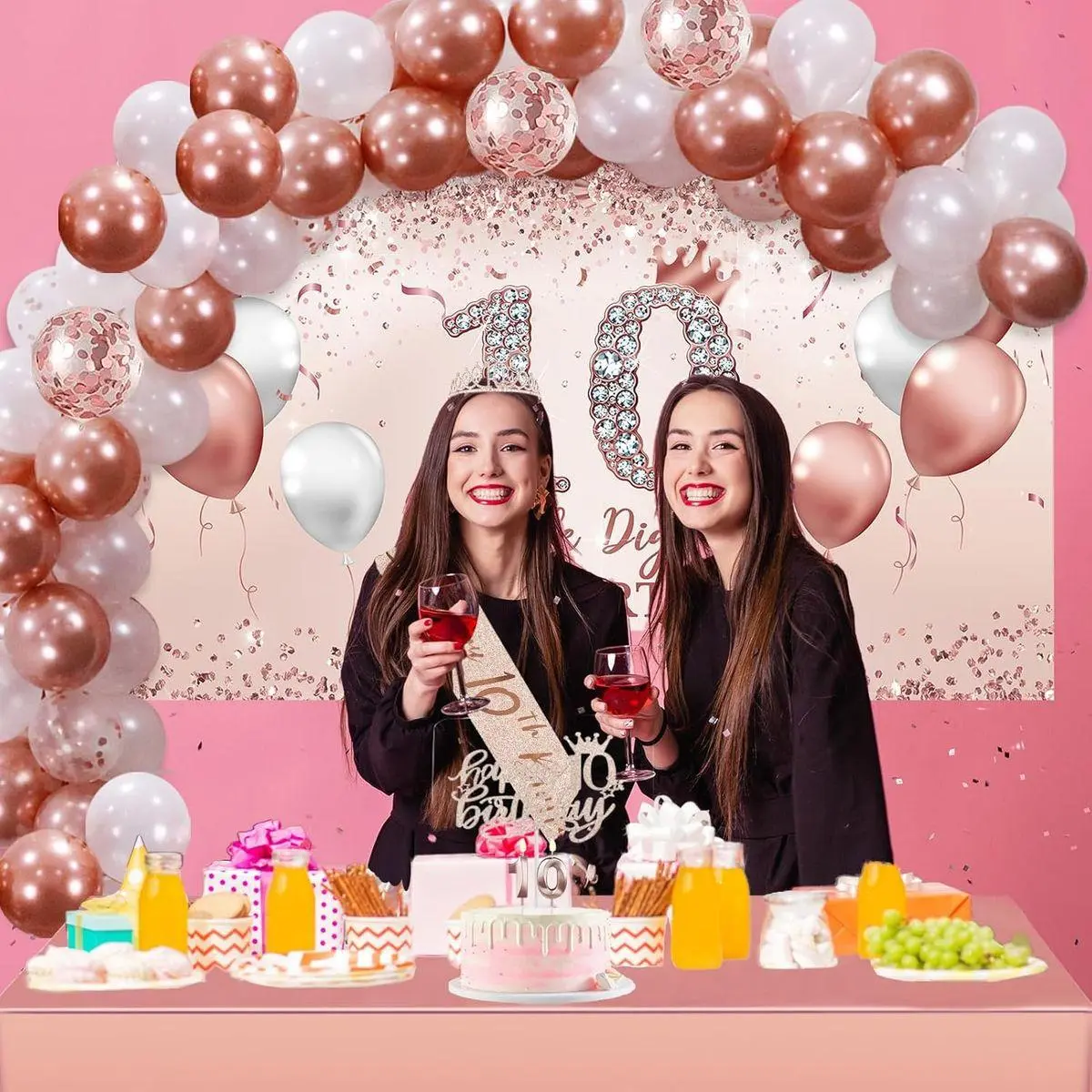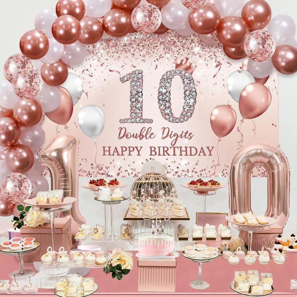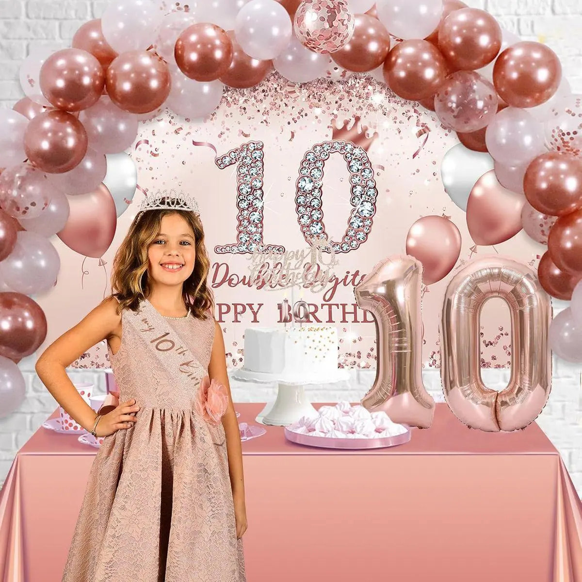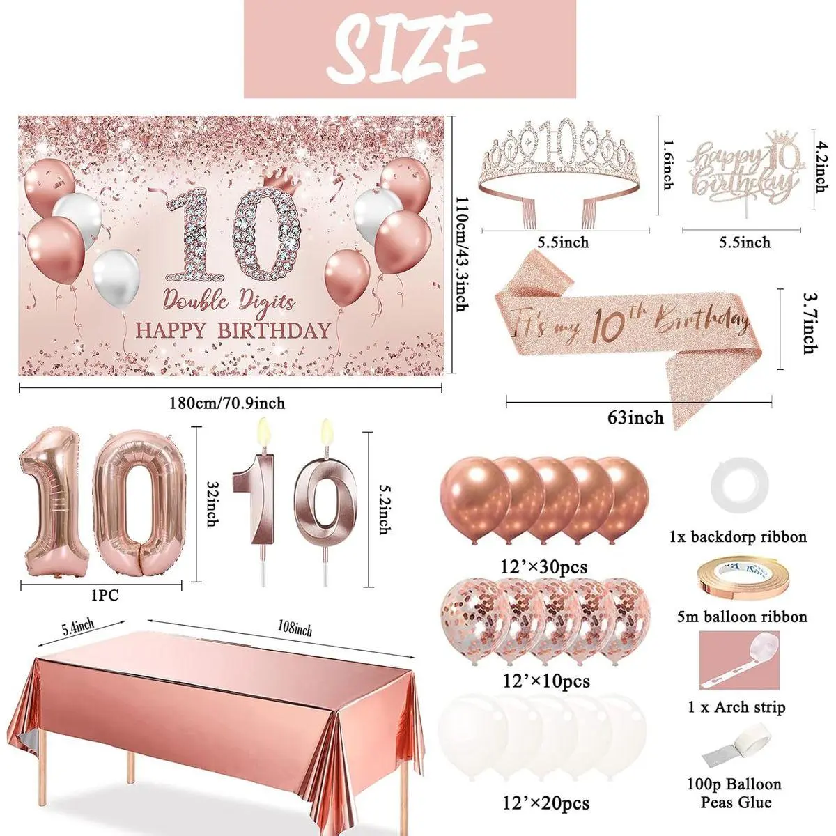 Included Components: 1pc 10th party banner, 1pc pink 10 birthday crown, 1pc sash and a pearl pin, 1pc happy 10th birthday cake topper, number 10 balloons 32inches, 1pc rose gold tablecloth.and 60 latex balloons. See more