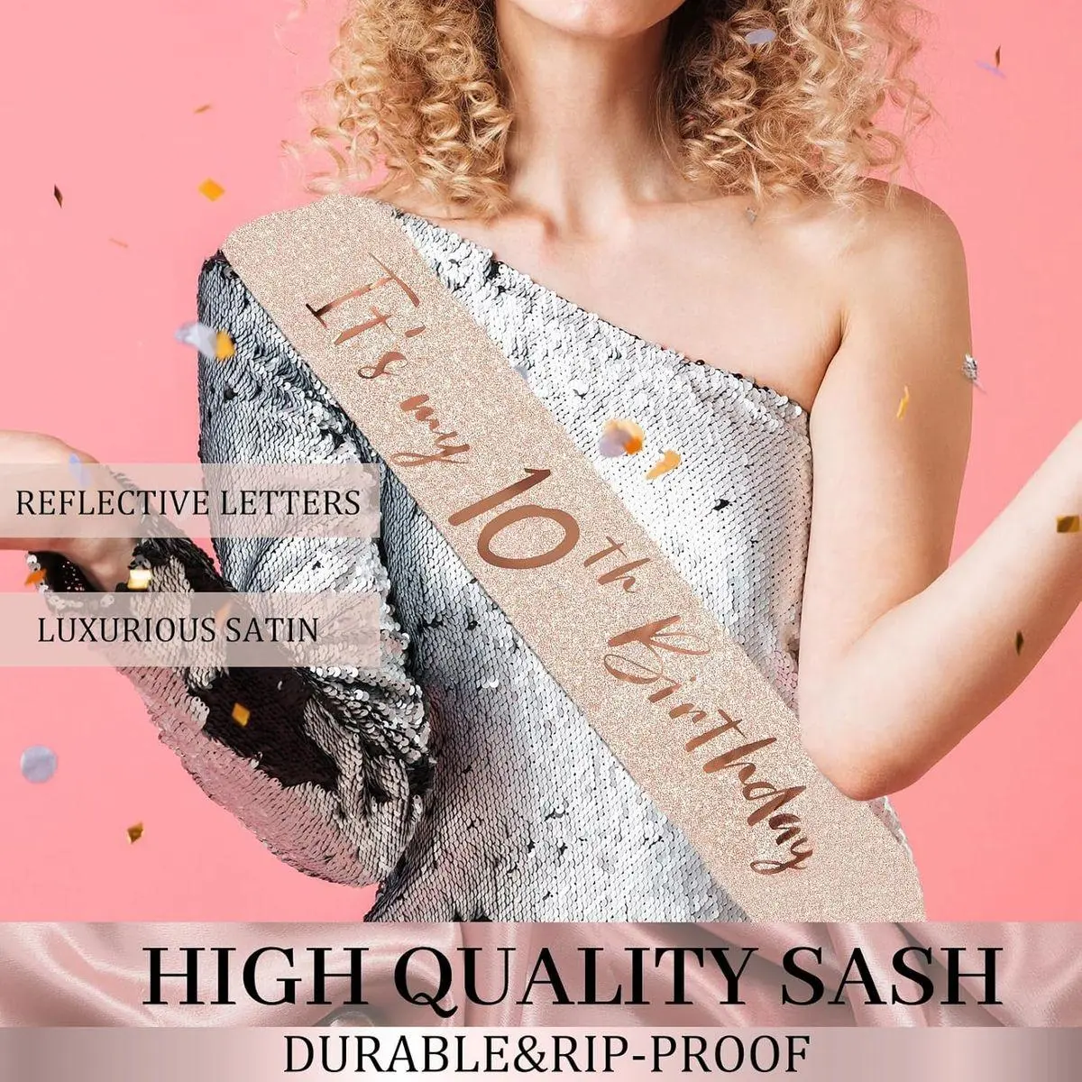 👑[10th Sash for girls] The rose gold birthday sash is made from high quality glitter fabric and printed with rose gold foil words. Elegant and gorgeous! The sash is in 63inch length and comes with a pretty pearl pin. You can adjust the length by using the pearl pin in the package. Th pin also put the perfect finishing touch on your party outfit.