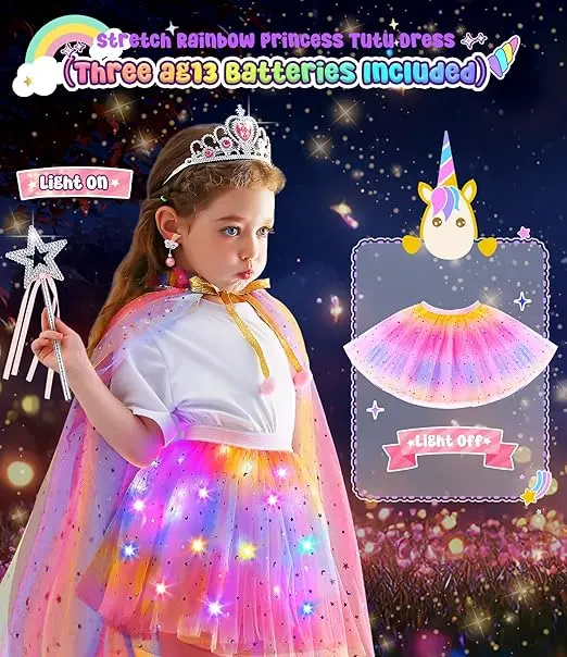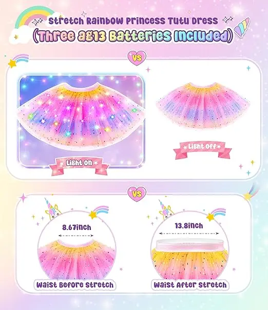 ·Magical Light-Up Tutu Skirts for Girls: Night coming, magic unfold—turn on rainbow lights, tutu transform into a dazzling display, capturing everyone's attention instantly. Your little one will be thrilled as her skirt comes alive with twinkling lights! Battery is included for effortless fun. Vibrant rainbow hues and playful star sequins, makes her sparkle when every twirl and leap. Stretchy waistband ensures a comfortable fit and room to grow, fluffy princess-like design enhances her beauty