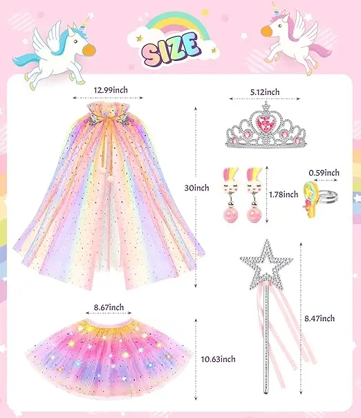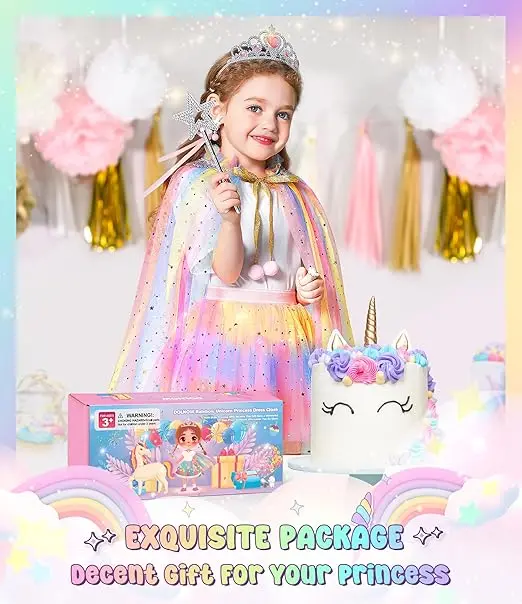 ·Flowing Sequin Unicorn Princess Capes: Length of princess cloak is 30inch, just nice for princess dress up. Fabric of the cape is very soft , not itchy. Bright rainbow color capes with sequin stars and sequin moon details, shining but without glittery mess. Golden shoulder strap has two pink balls, easy to tie on and off, also really cute. My child can't put it down, and she says she feels like a princess when she wears it , then go around casting spells on everyone with the wand