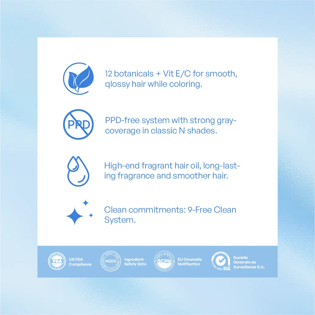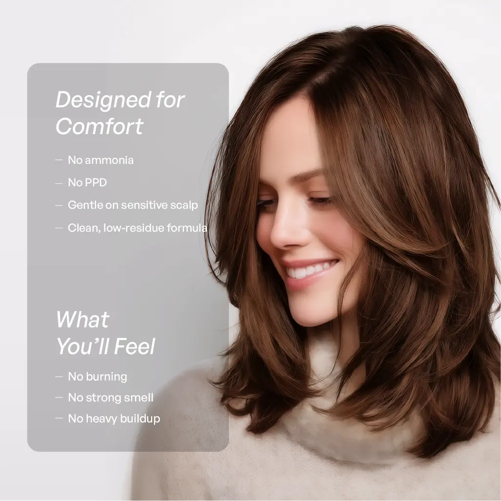 A light, clean scent replaces the harsh dye odor, so coloring feels fresh and comfortable — not overwhelming.